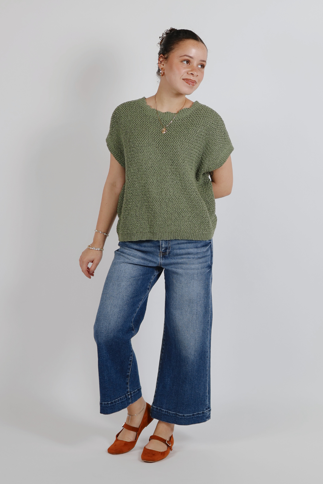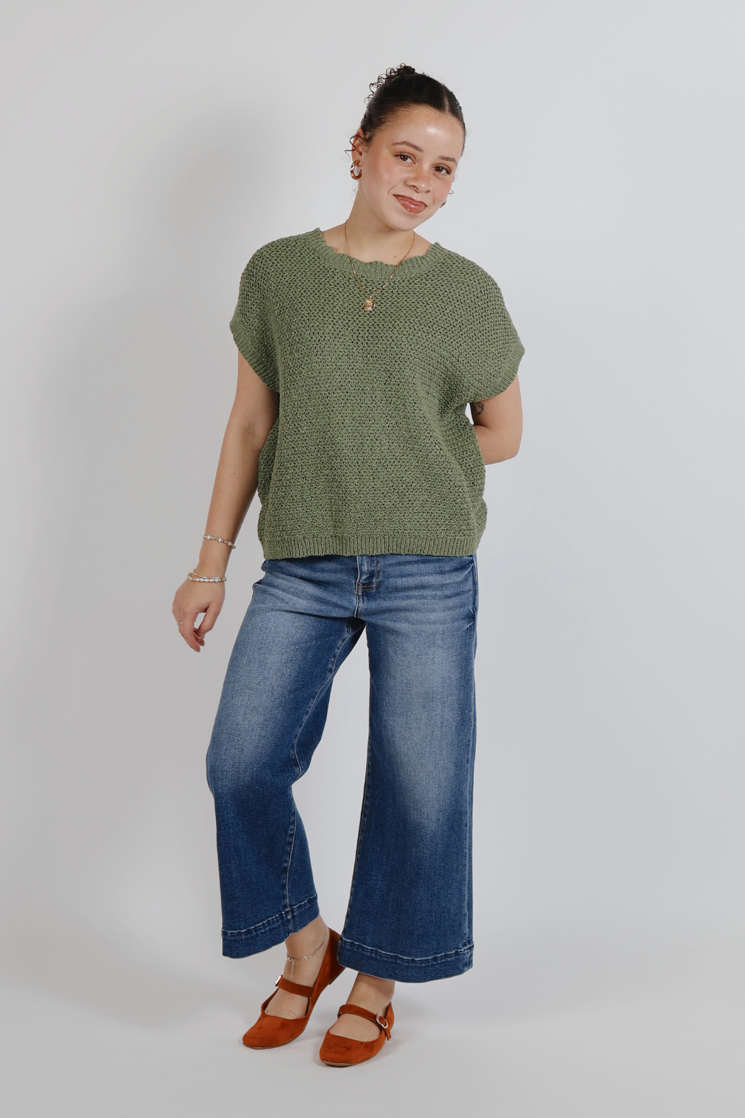 Designed with a classic crew neckline, flattering cap sleeves, and ribbed trim for a clean finish, this top pairs effortlessly with denim, trousers, or skirts. Whether styled casually or dressed up with accessories, the Coastal Weave Knit Top is the perfect piece for everyday wear and easy seasonal transitions.