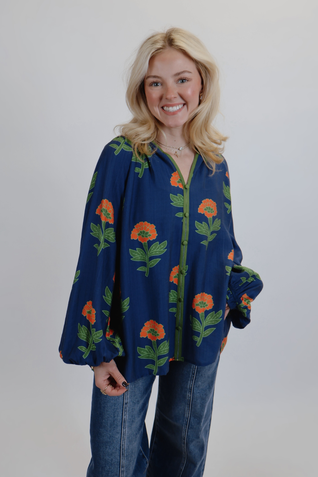 Fresh, feminine, and oh-so-effortless — our Garden Charm Blouse is the perfect go-to for both casual days and dressed-up nights. Designed with a flattering V-neckline and button-front closure, this blouse features billowy long sleeves with elastic ruffle cuffs for that touch of playful charm. The relaxed, flowy fit keeps it easy and breezy, while the contrast binding adds just the right pop of detail. Pair it with your favorite denim for a laid-back look or tuck it into a skirt for an elevated vibe.
