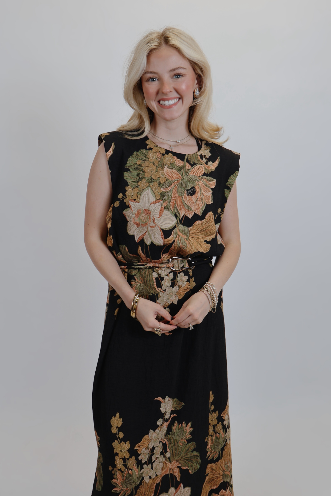 Step into effortless elegance with our Golden Garden Midi Dress. This sleeveless floral print dress features a classic round neckline and a flattering self-tie waist with chic metal tips for a touch of shine. The lightweight woven fabric drapes beautifully, creating a soft, feminine silhouette that’s perfect for any occasion. Fully lined and non-sheer, it offers both comfort and confidence all day long.