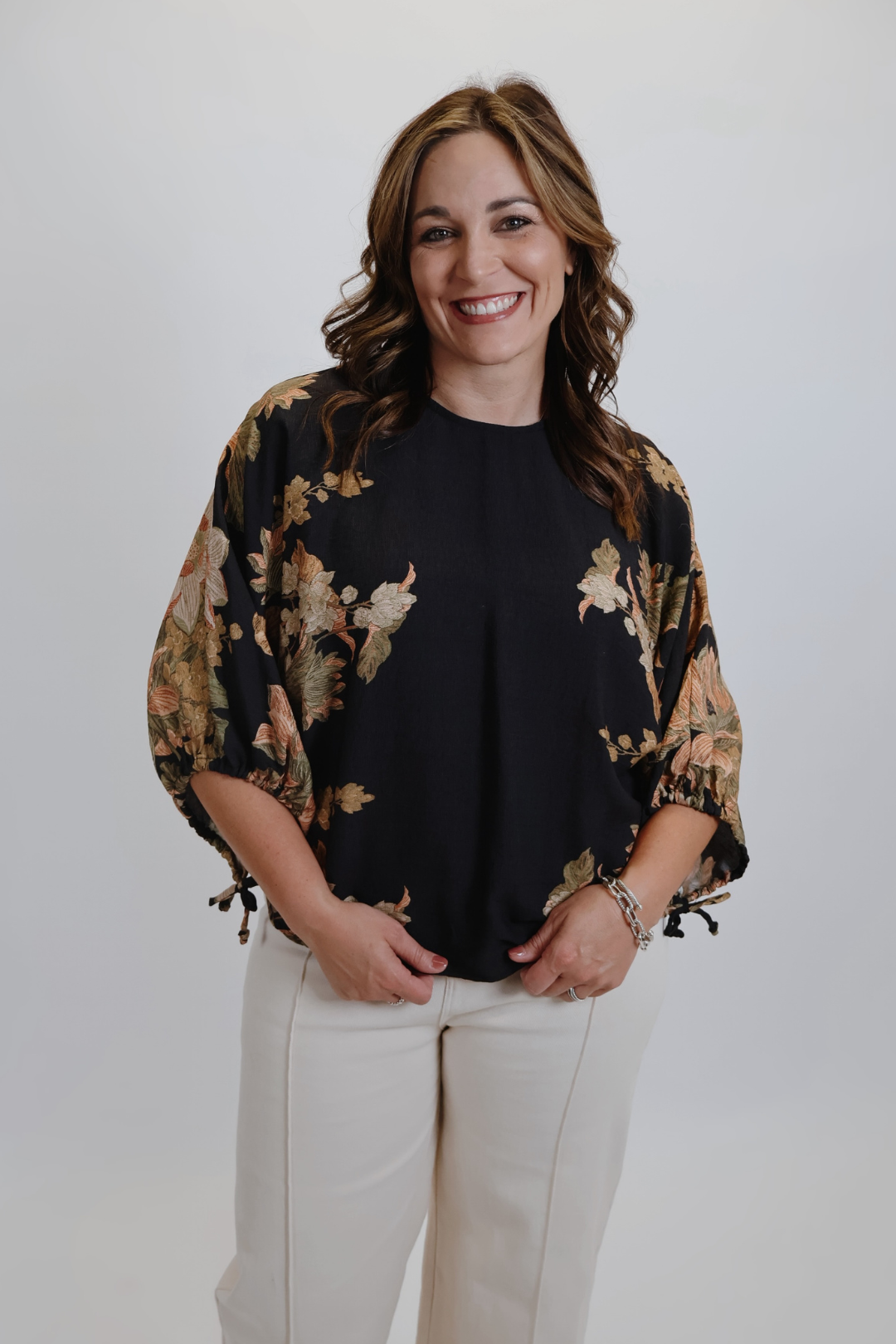 Add a touch of effortless elegance to your wardrobe with our Midnight Garden Puff Sleeve Top. This chic black blouse features a subtle botanical print on a softly textured woven fabric. The ¾ length puff sleeves are finished with gathered hems and delicate tie details, offering a feminine silhouette that’s perfect for day or evening wear. A button closure at the back completes the look with understated charm. Lightweight and unlined for all-day comfort.