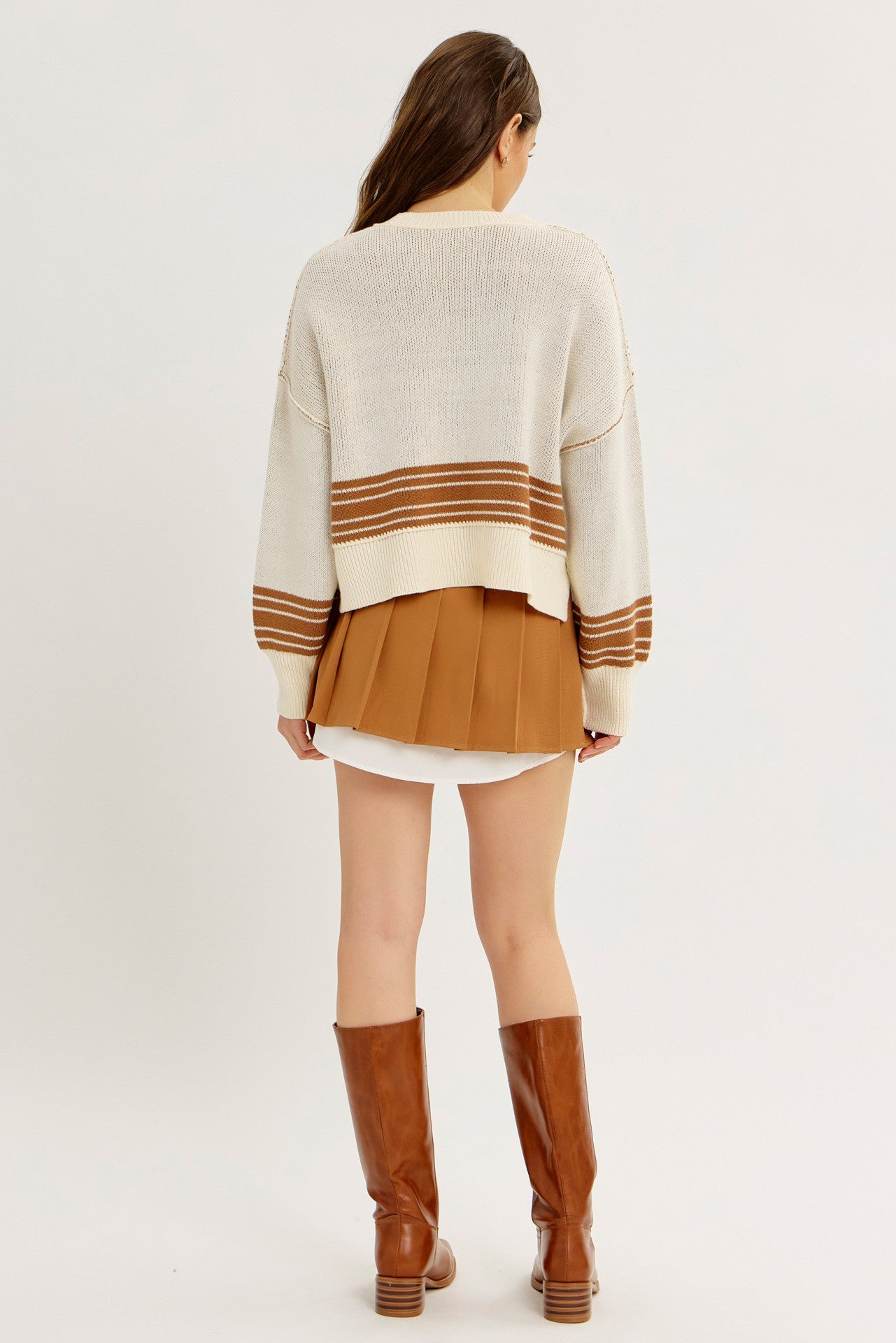 Effortlessly casual with a touch of timeless charm, the Autumn Lane Striped Sweater is the perfect piece for relaxed, everyday style. Designed with a boxy silhouette and dropped shoulders, this soft knit offers a cozy yet flattering fit. The classic round neckline and contrast stripe detailing along the sleeves and hem add a modern, laid-back vibe. Easy to pair with skirts, trousers, or your favorite denim — this sweater transitions seamlessly from weekday to weekend.