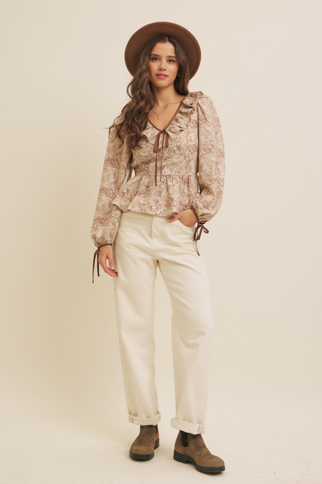 Feminine and timeless, the Autumn Romance Blouse captures vintage-inspired charm with a modern twist. Featuring a flattering V-neckline framed by delicate ruffles and finished with contrast bow ties at the neck and cuffs, this piece adds graceful movement and detail to any look. The elegant toile print and babydoll silhouette bring a soft, romantic feel, while the lightweight lining ensures comfortable all-day wear.