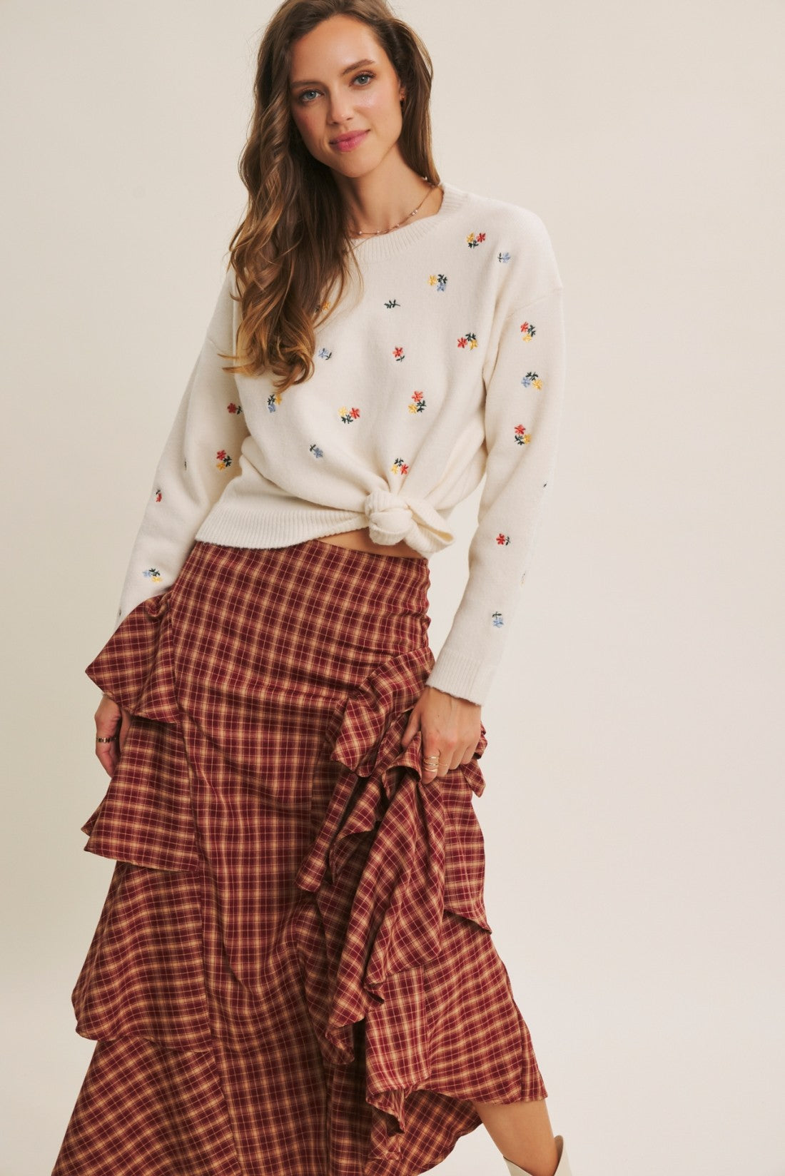 Charming and cozy, the Cottage Bloom Sweater brings effortless femininity to cooler days. Crafted from a soft recycled poly-wool blend, this sweater features delicate floral embroidery throughout for a timeless, handcrafted feel. The round neckline, ribbed hem, and relaxed fit make it easy to style for both work and weekend looks.