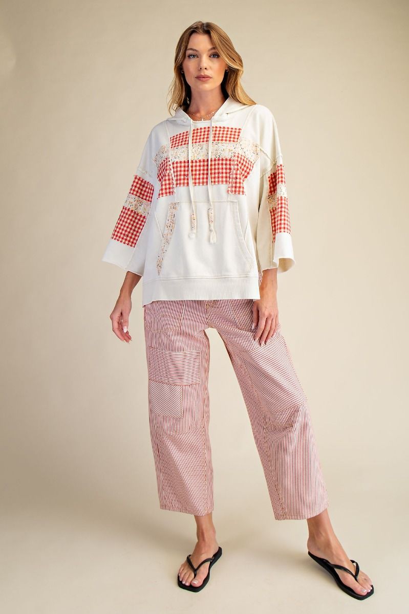 The Everly Patch Mix Pullover blends cozy comfort with playful, patchwork charm. Designed in a mineral-washed knit, this relaxed, oversized hoodie features wide 3/4 sleeves, a kangaroo front pocket, and a soft hood with tassel-tipped drawstrings. Mixed floral and gingham patches add a handcrafted, quilt-inspired touch that makes each piece feel unique. Perfect for laid-back days, weekend errands, or pairing with your favorite joggers or denim.