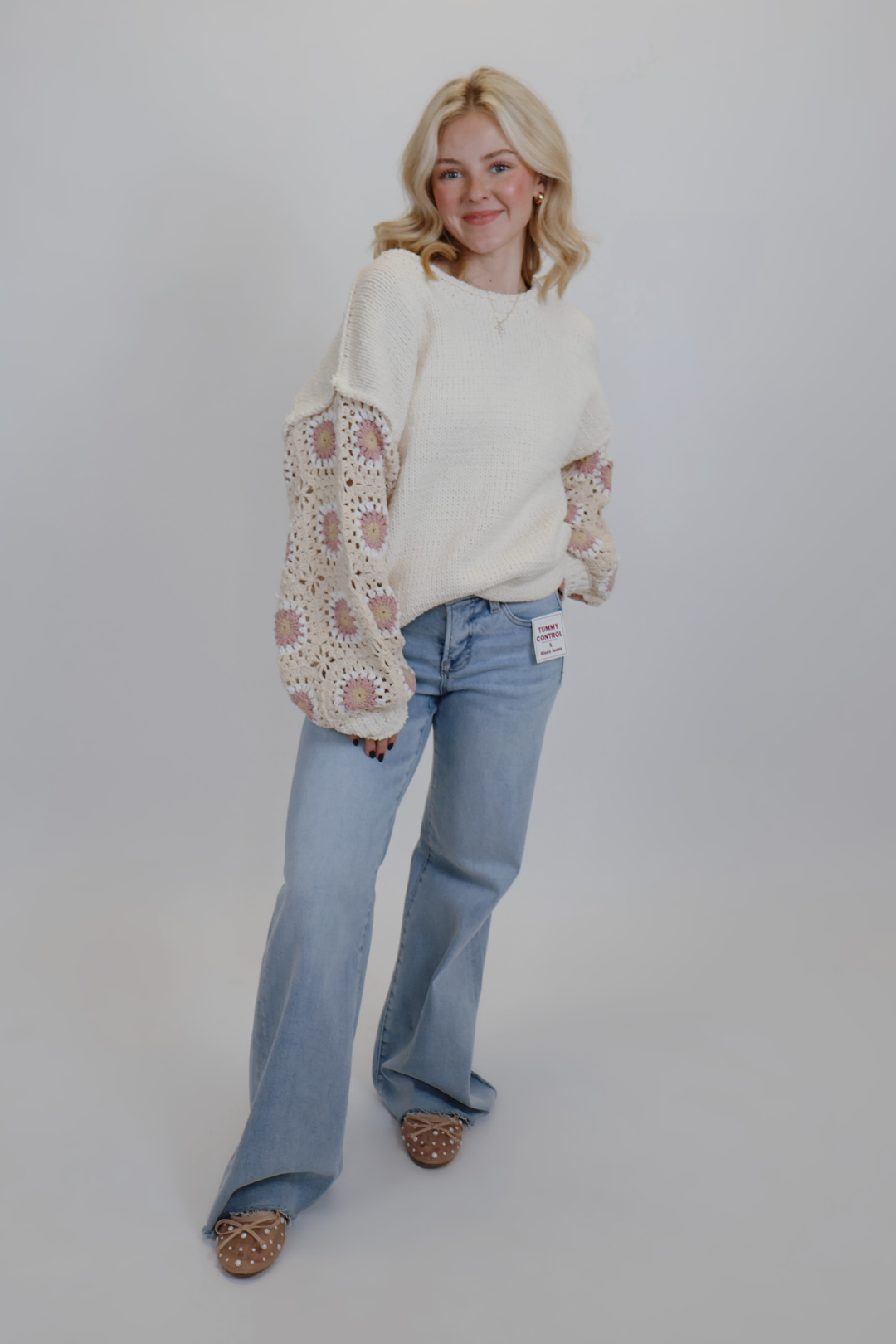 Cozy meets cottage charm in our Ivory Dream Crochet Sweater. Designed with a relaxed silhouette and a soft ivory cream body, this sweater features a round neckline and playful balloon sleeves detailed with hand-crocheted granny square patterns. The intricate sleeves add a vintage-inspired, artisanal touch, while the chenille knit body keeps things plush and comfortable. Finished with ribbed trim for a softly structured shape.