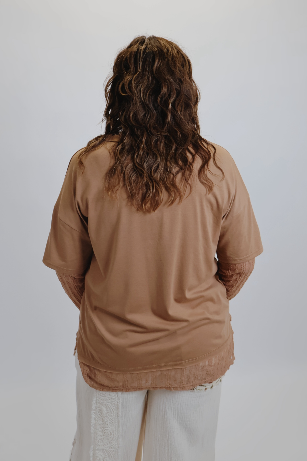 The Mocha Lace Layered Knit Top blends casual comfort with a touch of feminine detail. Designed in an oversized fit, this soft knit features a round neckline, drop shoulders, and a relaxed patch pocket for that laid-back vibe. What sets it apart are the floral lace long sleeves and matching lace trim at the hem—adding texture and charm to a timeless everyday silhouette.
