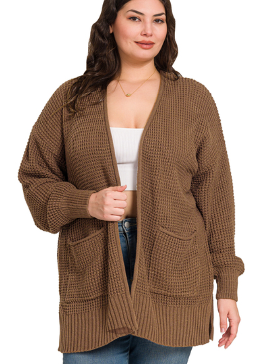 Wrap yourself in cozy style with our Everyday Comfort Waffle Knit Cardigan . Featuring a relaxed fit and midweight waffle knit, this piece is perfect for layering through every season. Designed with an open front and front patch pockets, it blends effortless comfort with a touch of laid-back sophistication.