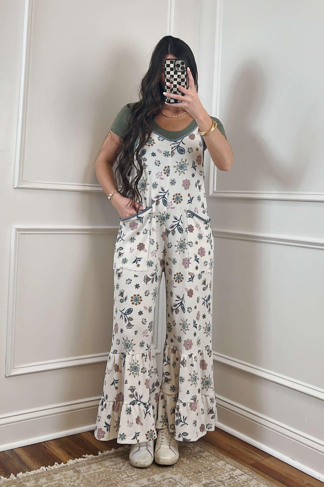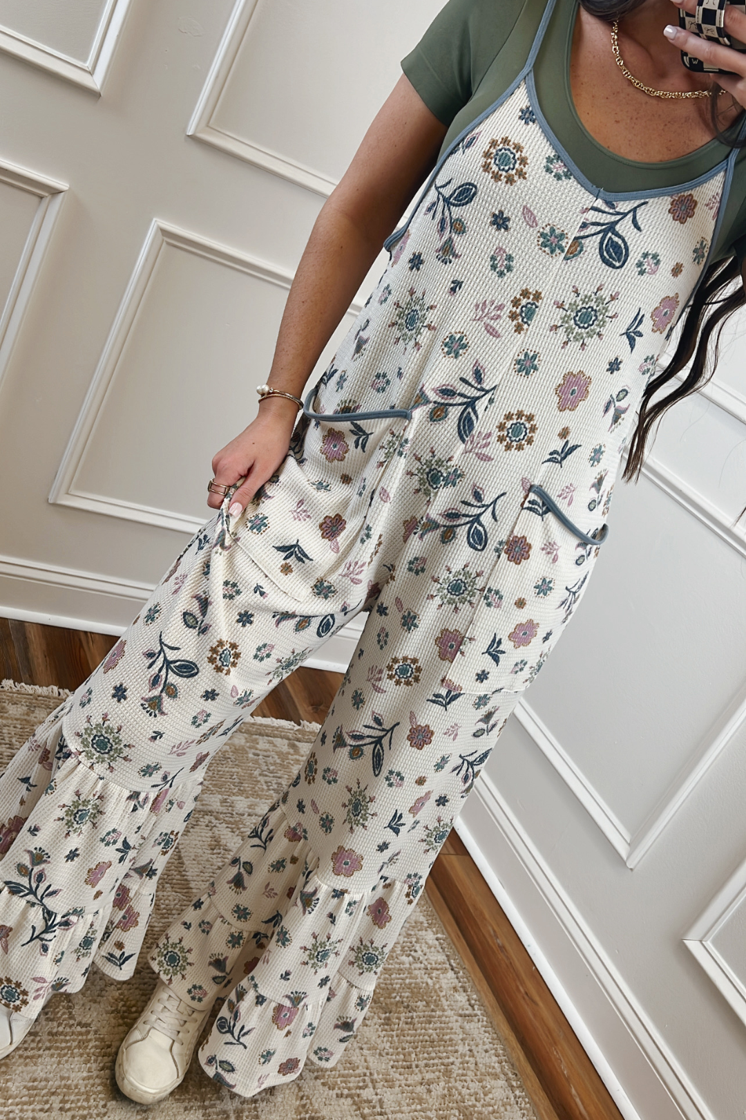 Elevate your style with our Floral Dream Waffle Knit Jumpsuit, perfect for laid-back days or dressing up for a casual outing. Featuring a multicolor floral print on a textured waffle knit fabric, this relaxed-fit overall adds a touch of vintage charm to any wardrobe. With adjustable straps for a customized fit and convenient side pockets with contrast binding, this piece blends comfort with style. The wide-leg silhouette offers effortless elegance, while the soft, breathable fabric ensures you'll feel as good as you look.