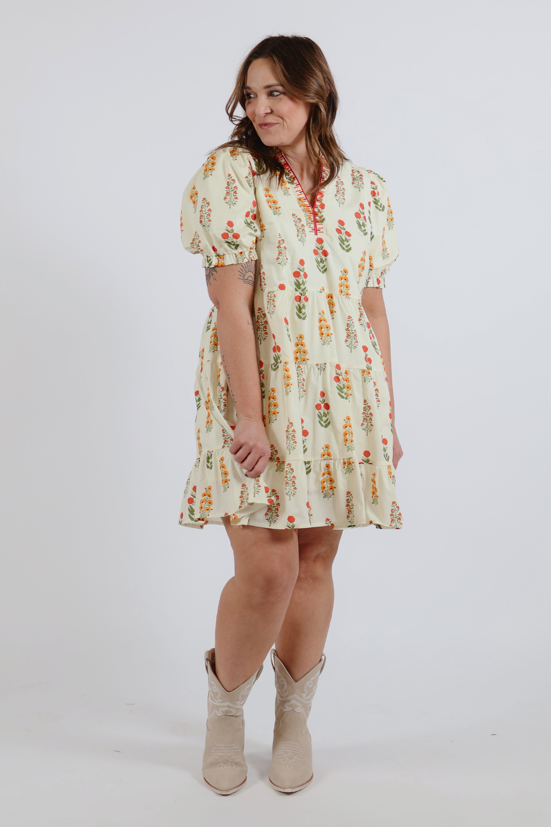 Soft, sweet, and effortlessly feminine, the Cottage Charm Tiered Dress is made for easy days and charming moments. Crafted from breathable cotton with a delicate floral print, this short dress features a relaxed tiered silhouette that flows beautifully with every step. The split neckline with decorative trim adds a thoughtful detail, while the short puff sleeves bring a touch of romantic, cottage-inspired style. Comfortable and lightweight, it’s a go-to piece for warm weather days.