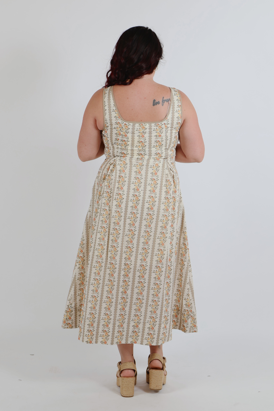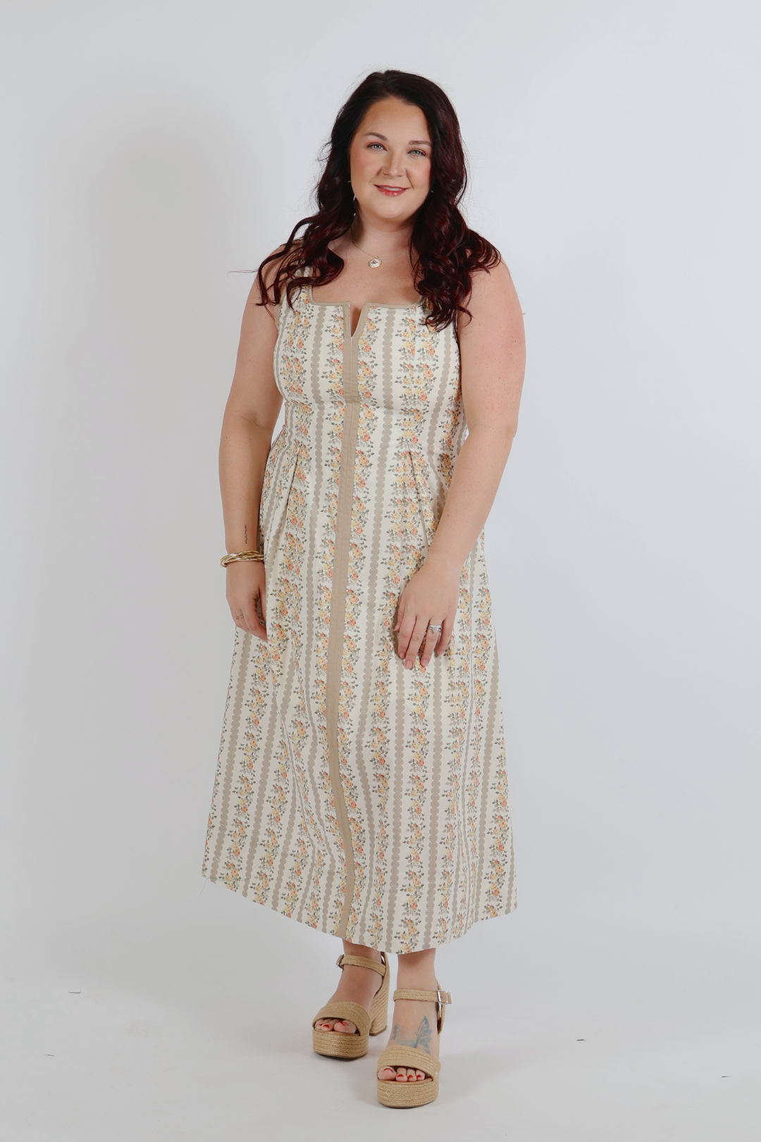 Soft, feminine, and effortlessly timeless, the Golden Meadow Stripe Midi Dress is a warm-weather staple you’ll reach for again and again. Designed with a floral stripe print, this sleeveless midi features a flattering V-notch square neckline and delicate pleated front detail that adds subtle shape and movement. The lightweight woven cotton keeps it breathable and comfortable, while side pockets add everyday ease. Fully lined and non-sheer, it’s an easy piece that transitions beautifully from daytime outings to casual gatherings.