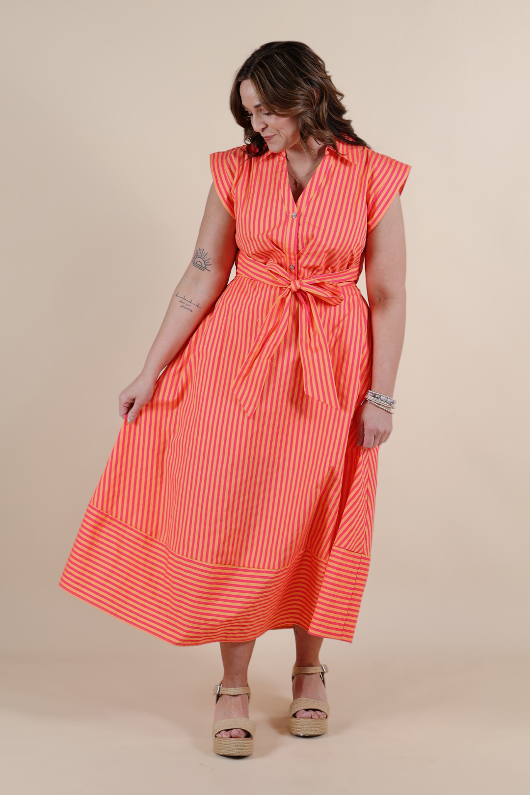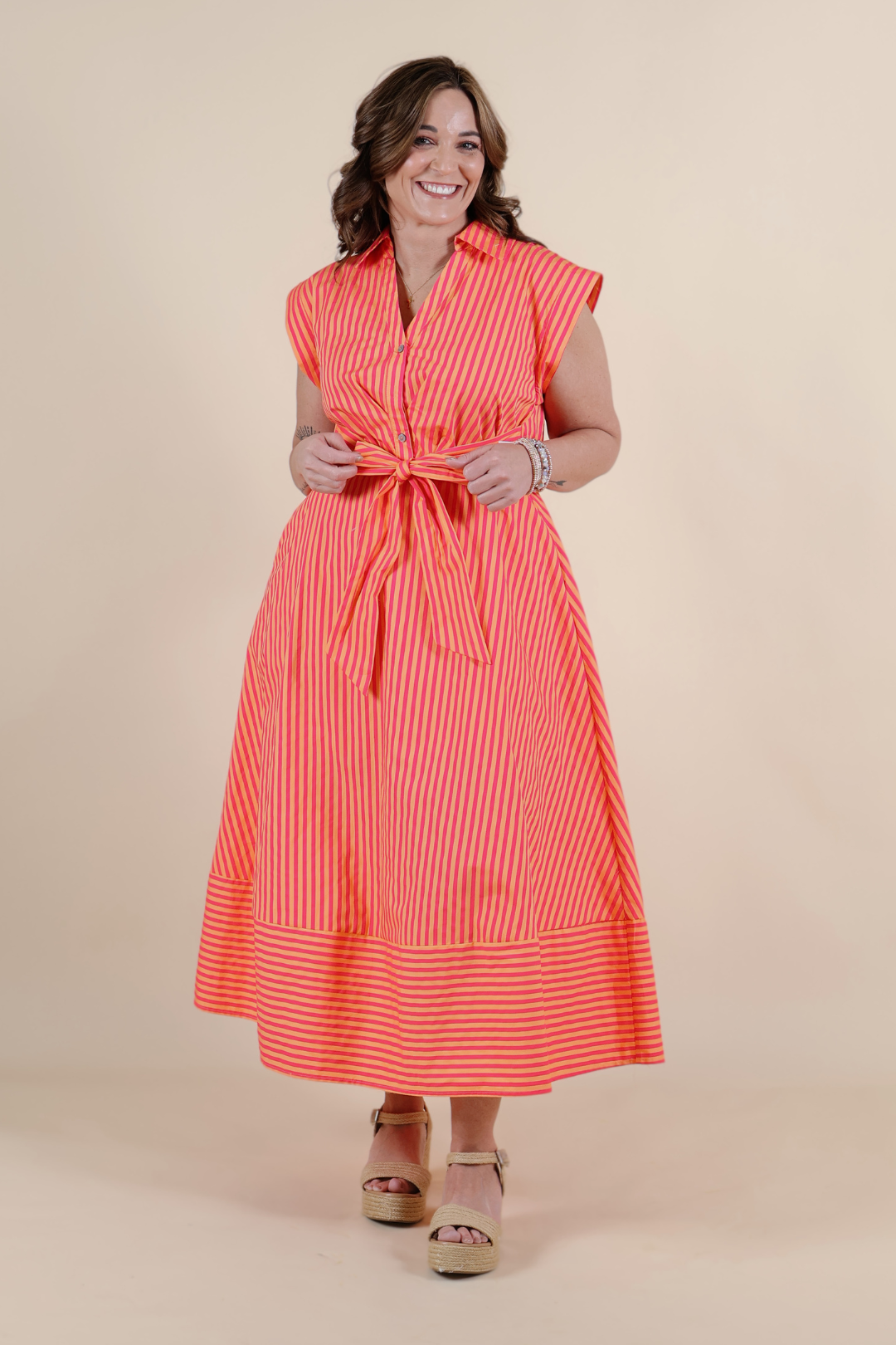 Bright, breezy, and full of charm, the Sunset Stroll Stripe Midi Dress is made for sunny days and easy evenings. Designed with cheerful stripes, this midi features cap sleeves, a flattering V-neckline with a self-tie detail, and a softly gathered waist that creates a feminine silhouette. Crafted from lightweight woven cotton and fully lined, it offers breathable comfort with a polished, non-sheer finish. Finished with side pockets for everyday ease, this dress is as practical as it is pretty.