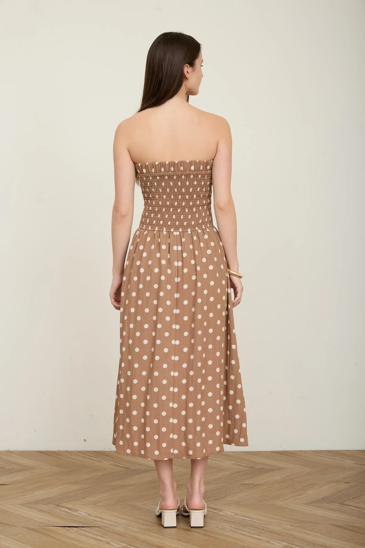 Playful, feminine, and effortlessly timeless — The Sweetheart Polka Dot Midi Dress is a charming piece perfect for sunny days and special moments. Designed with a flattering strapless silhouette, this dress features a fitted bodice with comfortable back smocking that creates a flexible and secure fit.