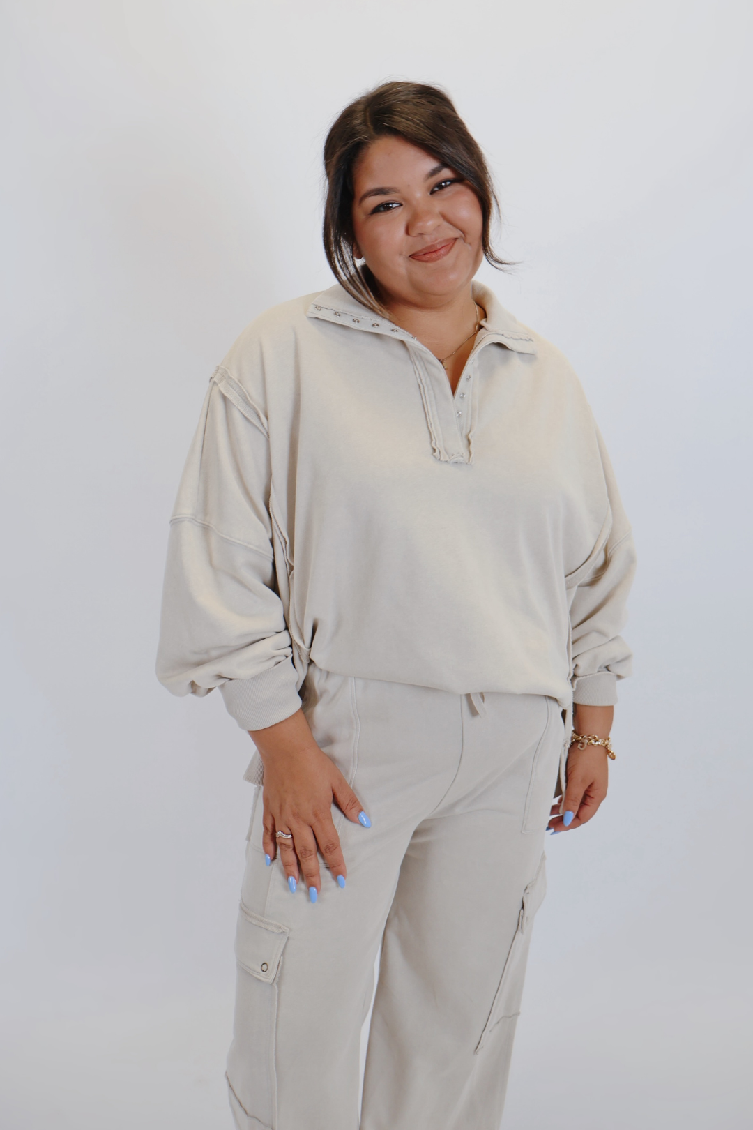 Cozy up in the Coffee Run Pullover, your new go-to for laid-back style with a playful twist. Featuring a collared neckline with snap buttons, dropped shoulders, and fun balloon sleeves with ribbed cuffs and subtle slits, this pullover blends comfort and charm. Its relaxed high-low fit with side slits makes it perfect for easy movement and casual coffee runs. Crafted from a soft cotton-poly blend, it’s as comfy as it is cute!