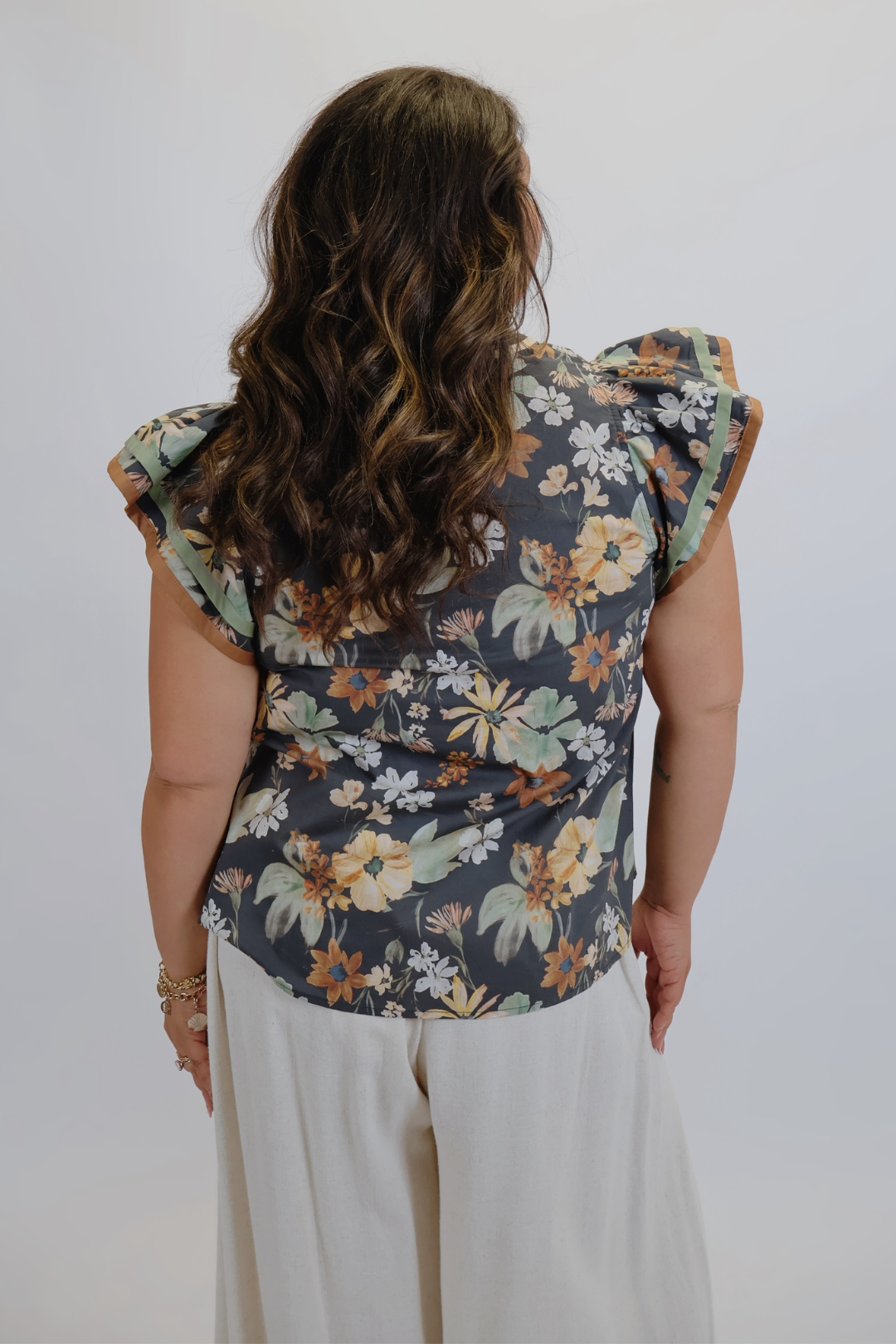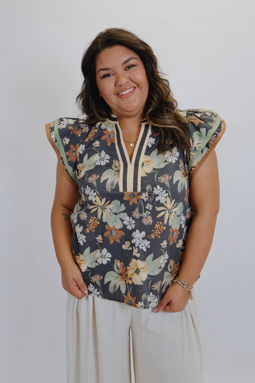 Add a touch of charm to your everyday wardrobe with our Garden Muse Flutter Sleeve Blouse. This lightweight pullover top features a vibrant floral print and tiered flutter sleeves for a soft, feminine silhouette. The multicolor accent V-neck band adds a bold, eye-catching contrast, making this blouse as unique as it is versatile.