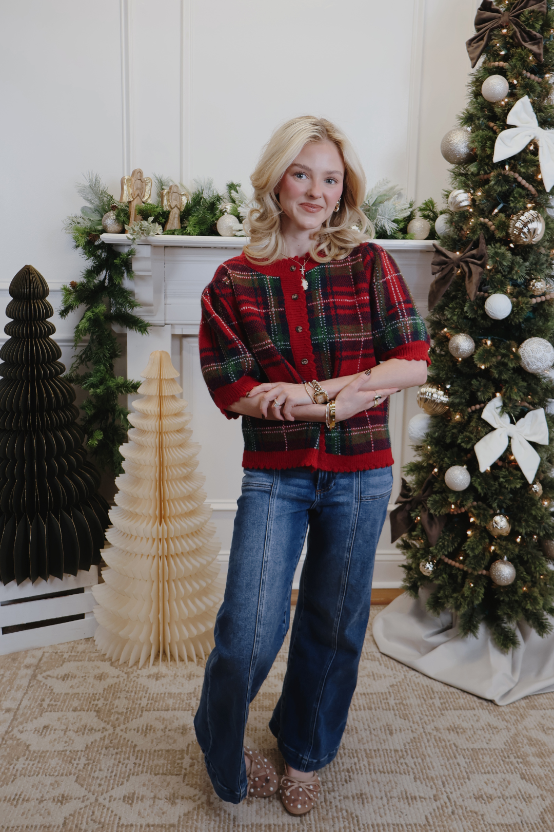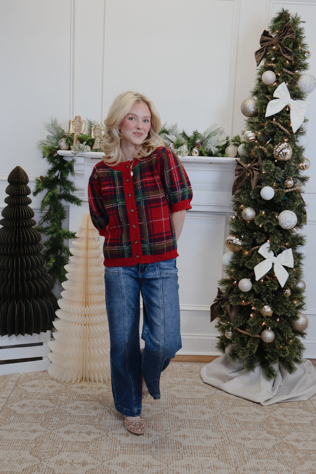 Add a touch of vintage charm to your wardrobe with the Cozy Charm Plaid Knit Top. This soft, medium-weight sweater top features a playful plaid pattern and short puff sleeves for a feminine twist on a classic look. Designed with a scallop edge neckline and front button closure, it’s the perfect mix of cozy and chic. Pair it with high-waisted jeans or skirts for a polished yet effortless outfit that transitions beautifully from day to night.