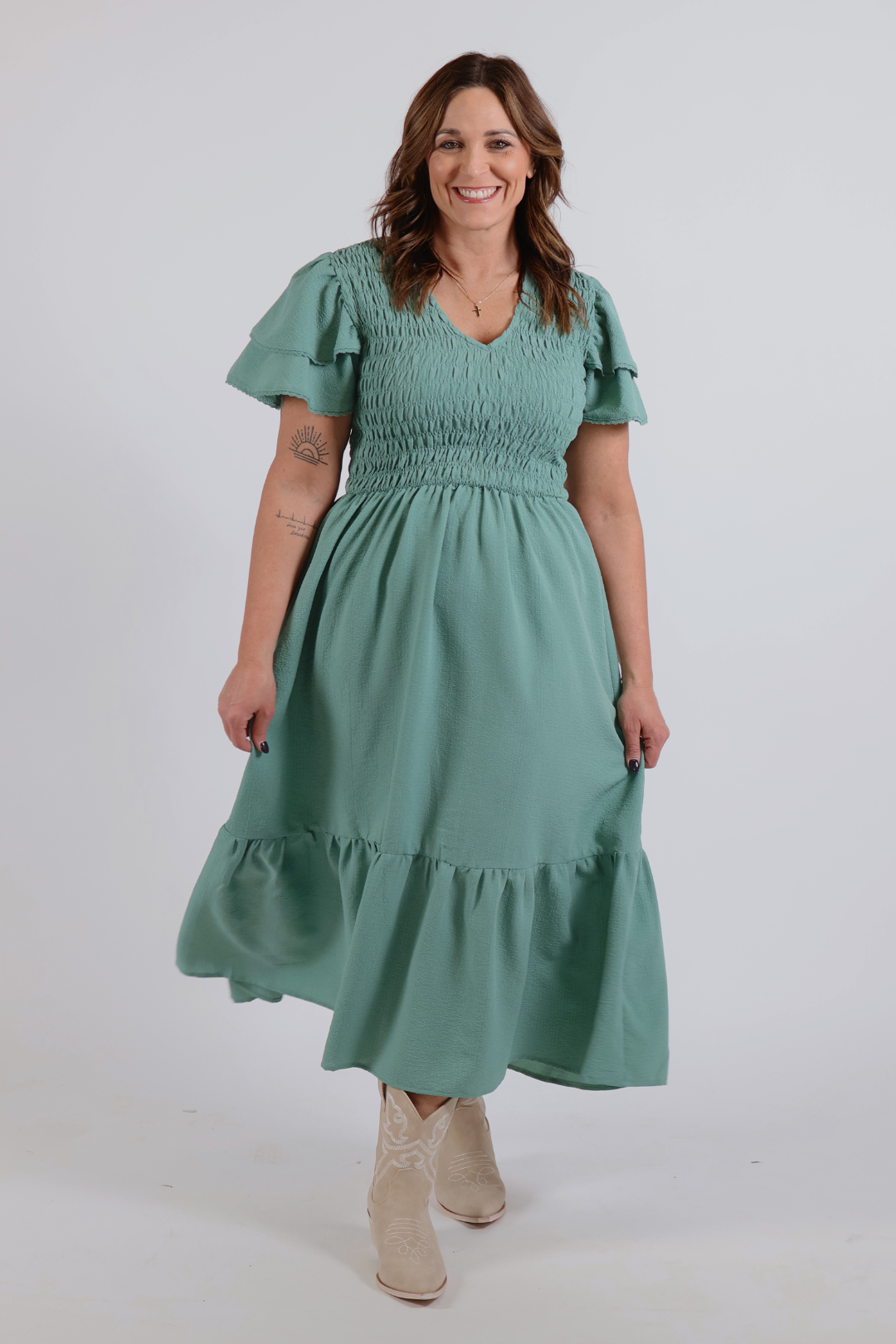 Soft, feminine, and effortlessly elegant, the Timeless Smock Ruffle Maxi Dress is a versatile staple designed for wear across every season. Featuring a flattering smocked torso, this dress offers a comfortable, flexible fit while creating a beautifully defined silhouette. The v-neckline and short ruffle sleeves add a delicate, timeless touch.