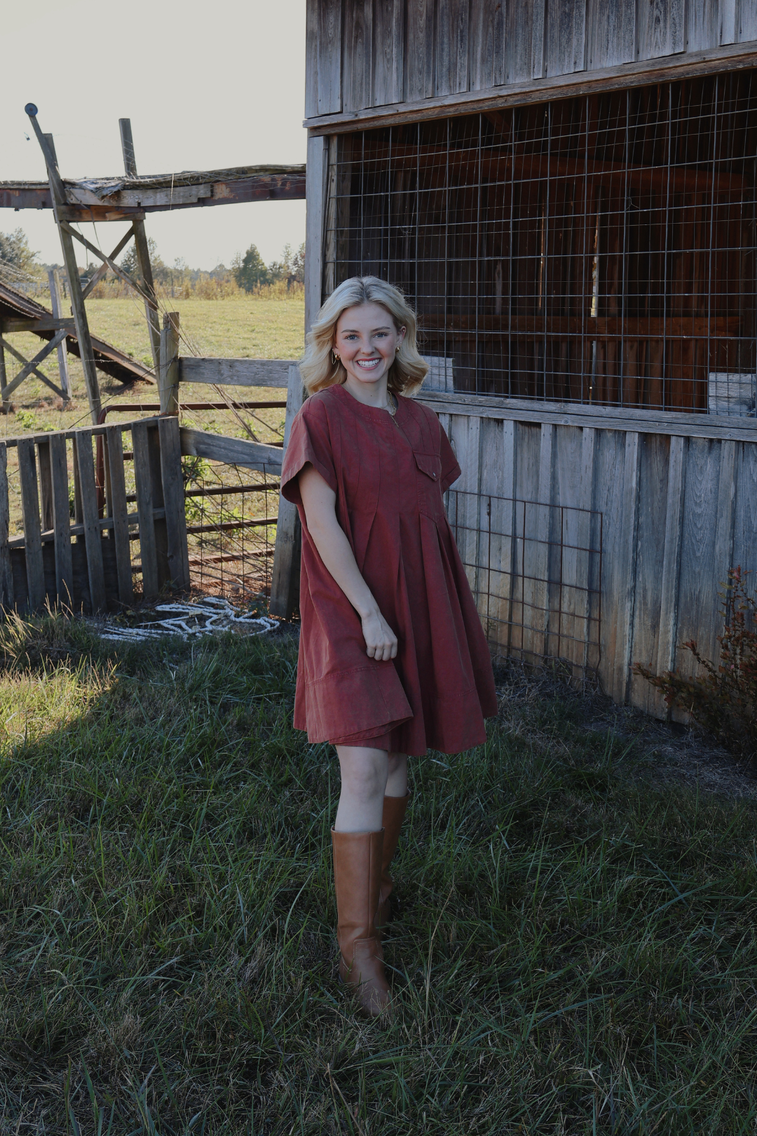 The Clay Canyon Pleated Dress brings a cool, laid-back edge to your everyday wardrobe. Crafted from a soft, enzyme-washed cotton blend, this A-line romper-style dress features pleated panel detailing that adds structure and flow in all the right places. The flap chest pocket with a button accent and cuffed short sleeves give it a touch of utilitarian style, while hidden side pockets keep it functional. Finished with a back keyhole and double button closure, the Clay Canyon Pleated Dress delivers comfort and polish in equal measure — perfect for sunlit strolls, weekend errands, or casual coffee dates.