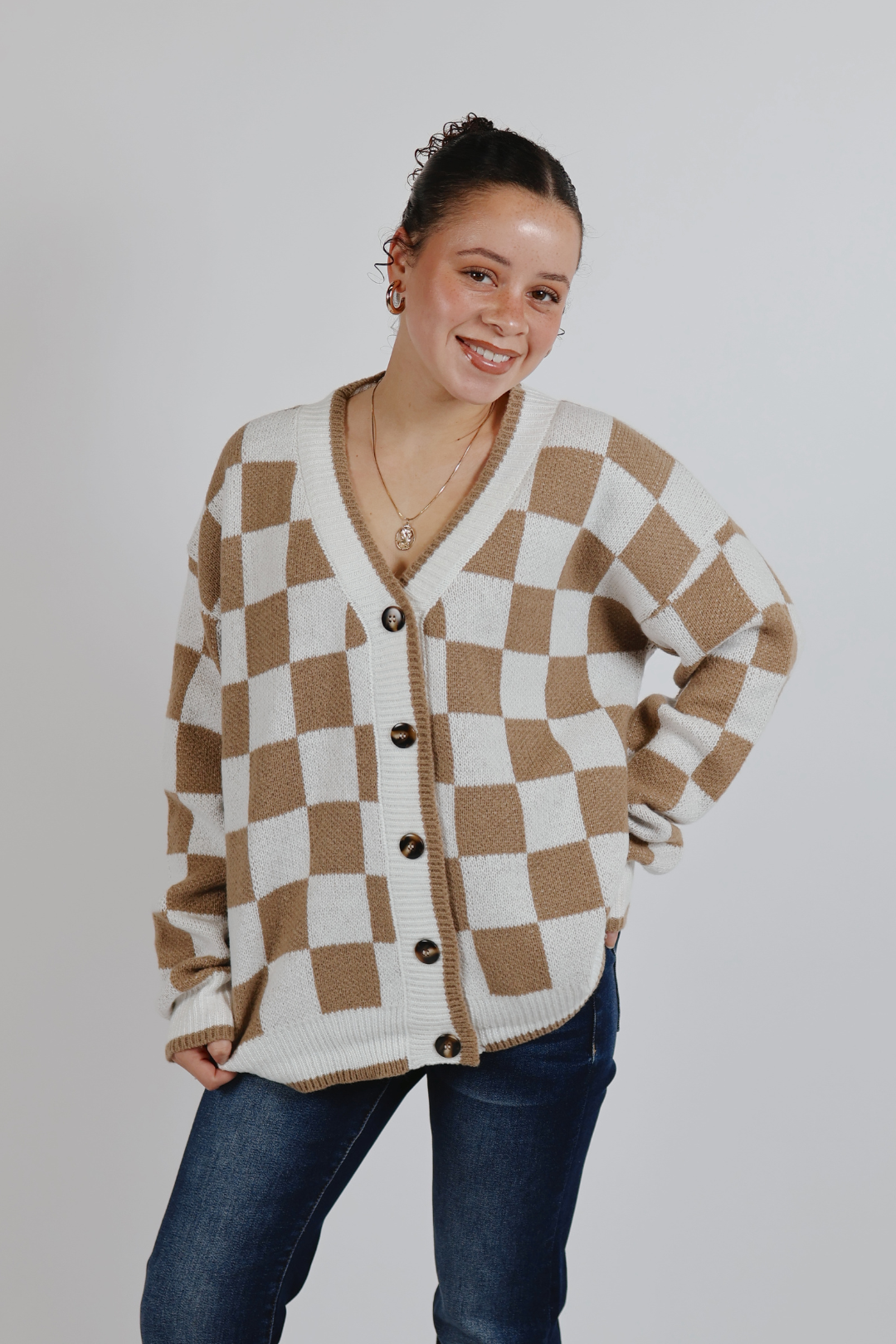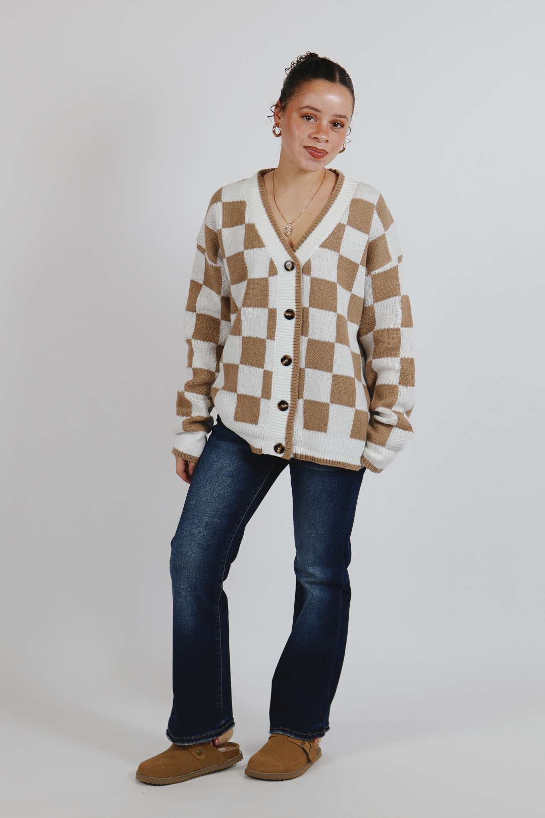 Classic pattern meets everyday comfort in the Cocoa Check Button Cardigan. Designed with a soft knit feel, this checkered cardigan features a relaxed silhouette with dropped shoulders for that effortlessly cozy look. Oversized buttons and ribbed trim add a playful touch, making it an easy layering piece you’ll reach for again and again.