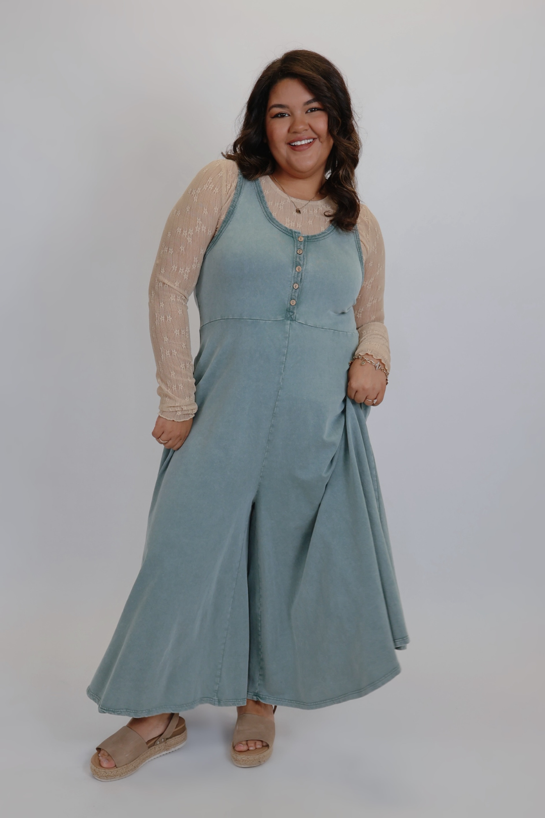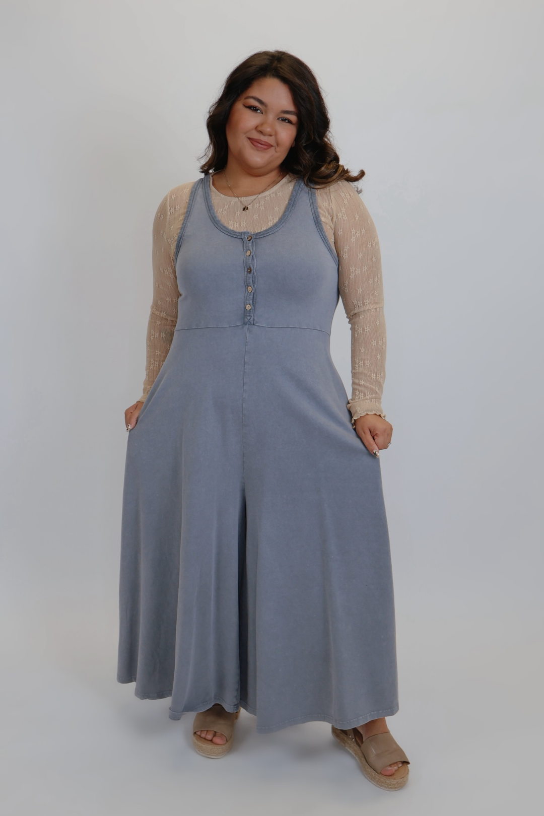 Embrace effortless style with the Driftwood Days Jumpsuit. This sleeveless, mineral-washed terry piece features a flattering scoop neckline and bodice seaming that shapes your silhouette. With a playful wide-leg design, side pockets, and a button-down front, it’s perfect for sunny days and casual adventures. Adjustable tie shoulders add a fun, flirty touch to your look.