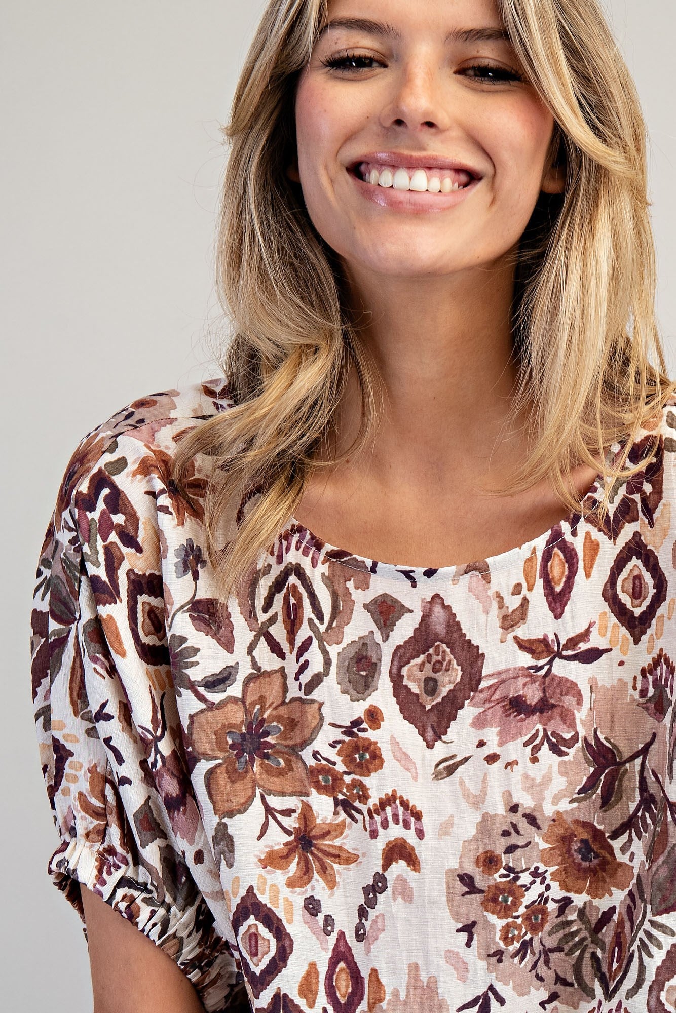Soft, flowy, and effortlessly feminine, the Dusty Garden Dolman Blouse brings an artful boho touch to your everyday wardrobe. Designed in a lightweight crinkled woven fabric, this blouse features an abstract floral ikat print that feels both earthy and romantic. The wide scoop neckline and relaxed draped bodice create an easy, flattering fit, while short dolman sleeves with elastic cuffs add soft structure and comfort. Perfect for dressing up with tailored pants or keeping it casual with denim, this top is a versatile must-have for transitional seasons.