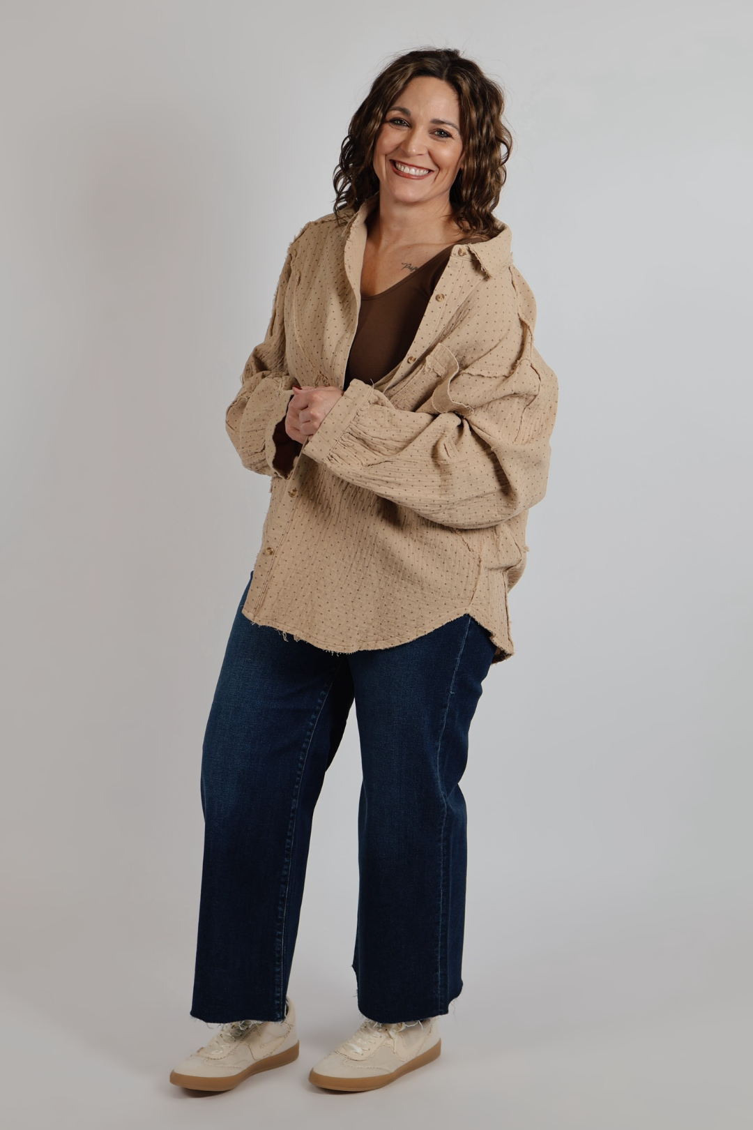 Your new favorite throw-on-and-go essential — the Dusty Trails Cotton Gauze Shirt brings effortless boho charm with a Western twist. Crafted from lightweight 100% cotton, this button-down features a mini polka dot texture, raw-edge seams, and a relaxed, boxy fit that drapes beautifully. The collared neckline, dropped shoulders, and frayed detailing give it that lived-in look we love, perfect for styling open over a tank or tucked into your favorite denim.