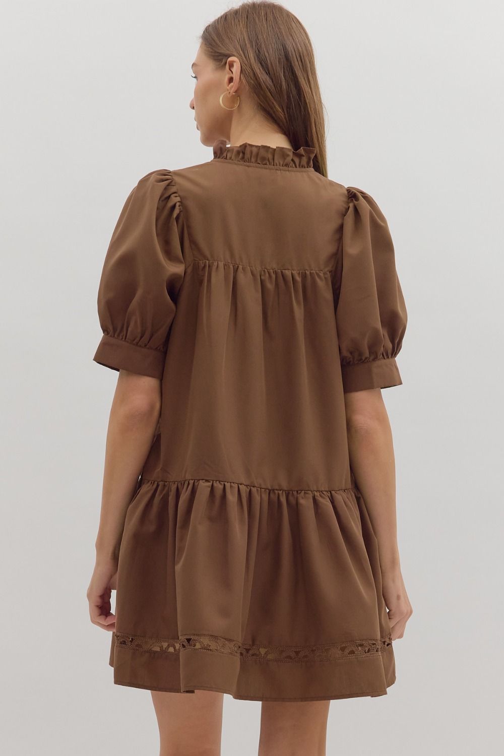 Sweet, simple, and effortlessly chic — the Cocoa Charm Mini Dress brings a touch of romance to your everyday wardrobe. Designed in a rich mocha tone, this lightweight woven dress features cuffed elbow-length sleeves, a tiered ruffle hem, and delicate scalloped trim insets along the yoke and skirt for a feminine finish. The pullover style and hidden side pockets keep it easy and comfortable for all-day wear.