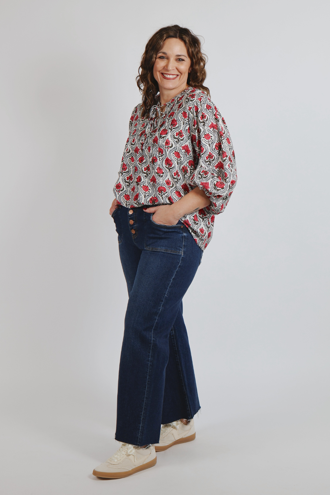 Breezy, feminine, and effortlessly chic — our Garden Grace Floral Tie Blouse is the perfect way to add a touch of charm to your everyday look. Featuring a mix of delicate floral prints, this blouse offers a flattering split neckline with a keyhole tie detail and soft pintuck accents for added texture. The 3/4 balloon sleeves with elastic cuffs complete the look with an airy, romantic feel.