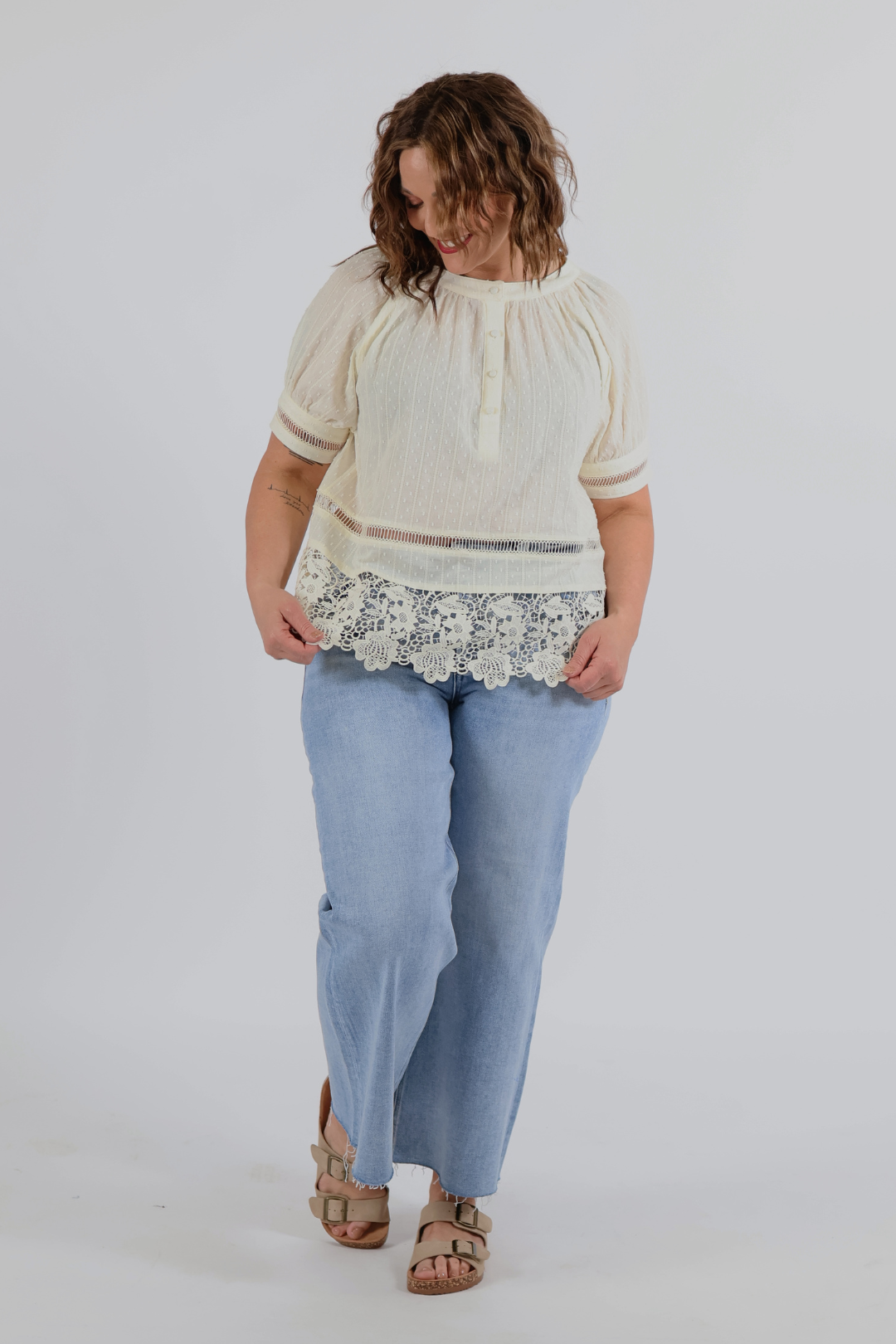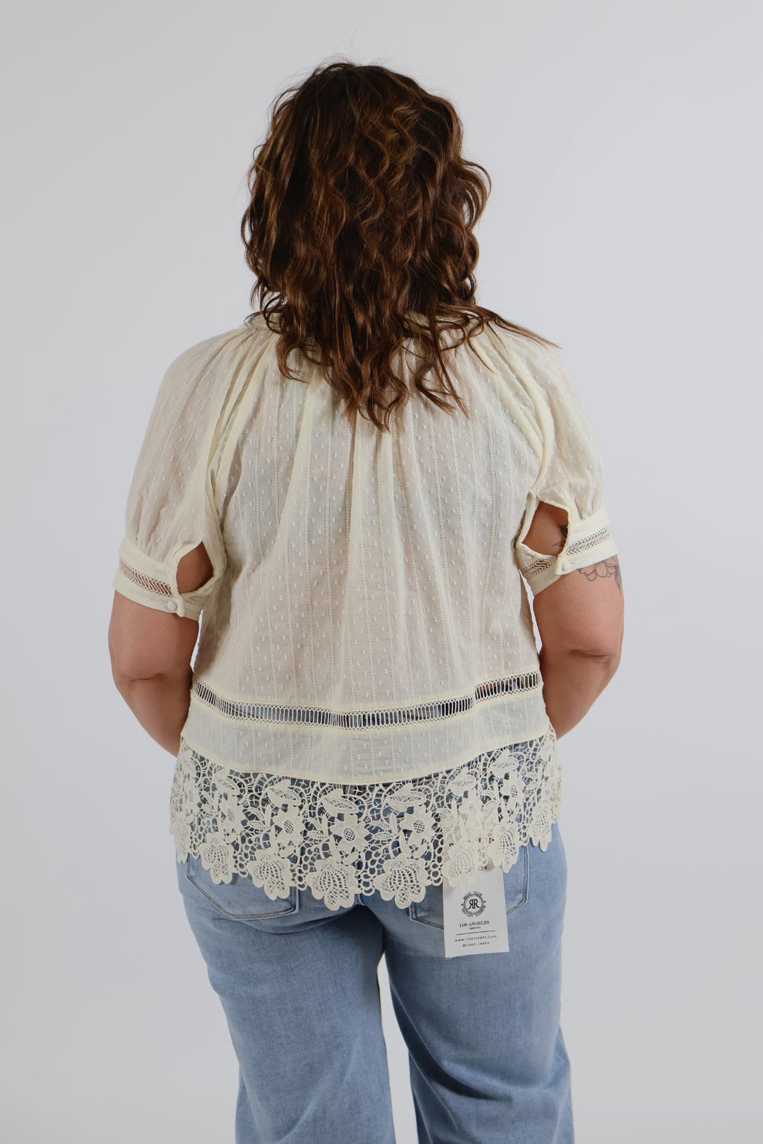 The Grace & Charm Trim Blouse blends timeless elegance with delicate feminine detailing. Designed in a lightweight textured cotton fabric, this blouse features a flattering gathered neckline with a half button front, soft short sleeves, and beautiful mixed lace trim accents that create a romantic boutique look. The breathable fabric and relaxed silhouette make it perfect for both everyday styling and special occasions.