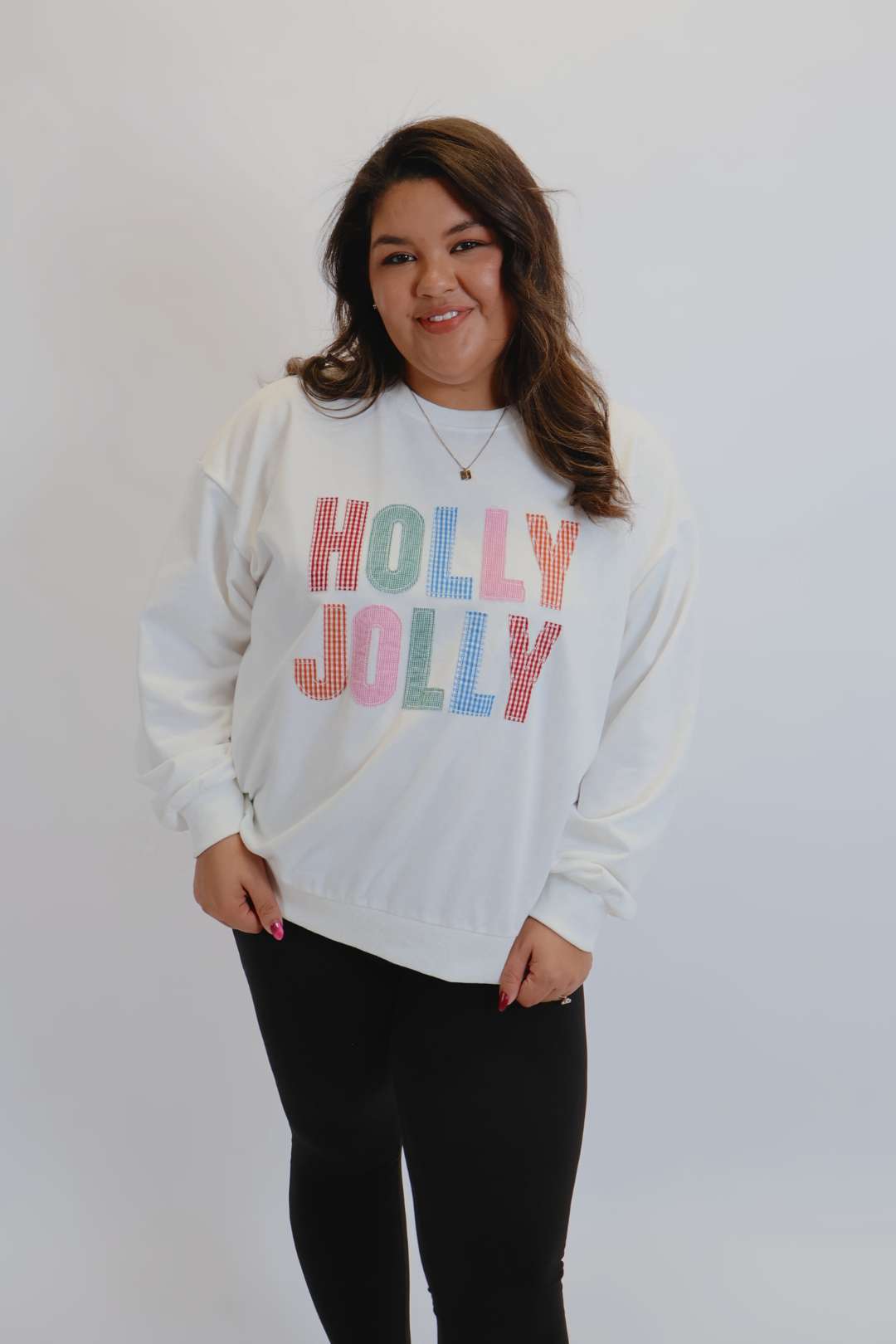 Get cozy and festive with our Holly Jolly Gingham Sweatshirt! This cheerful white pullover features playful multicolor gingham lettering that spells out “HOLLY JOLLY” for the ultimate dose of holiday spirit. Soft, relaxed, and oh-so-merry — it’s the perfect pick for tree-trimming nights, Christmas movie marathons, or matching photos with your besties.