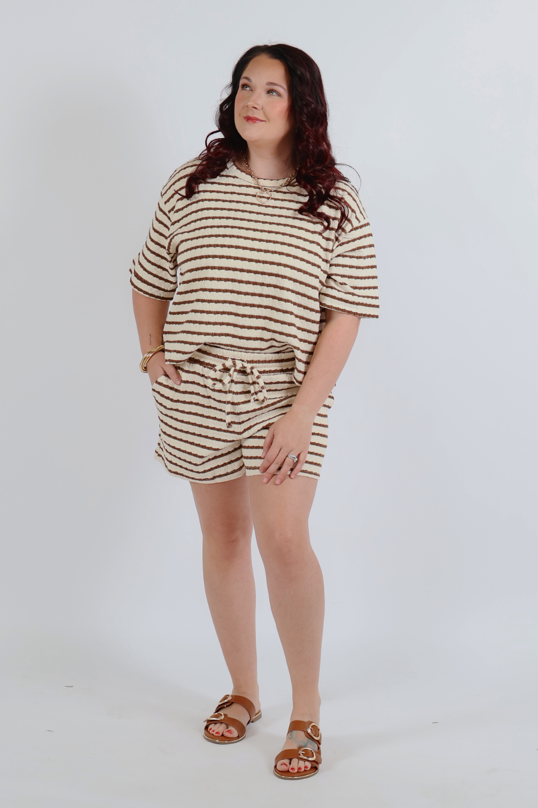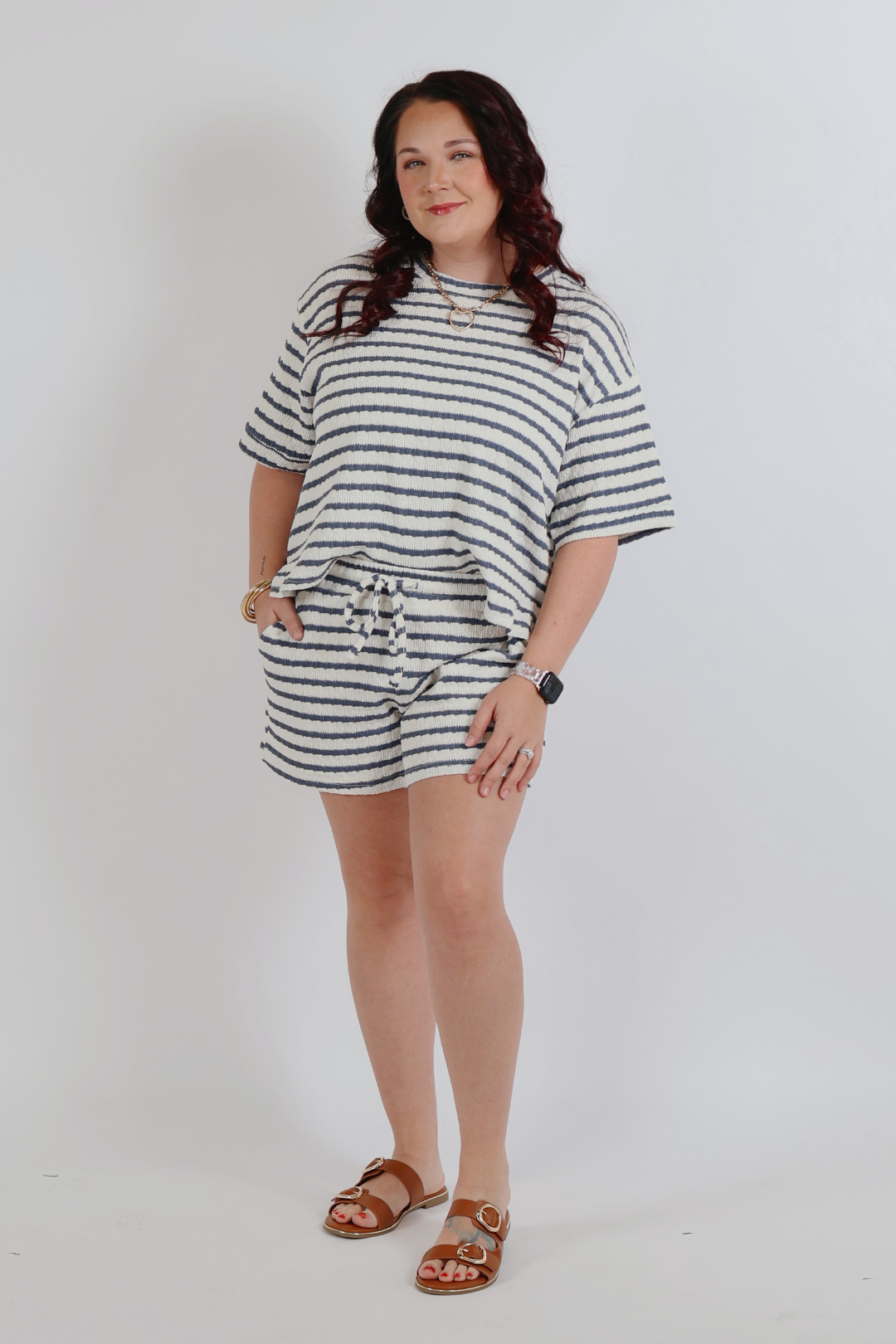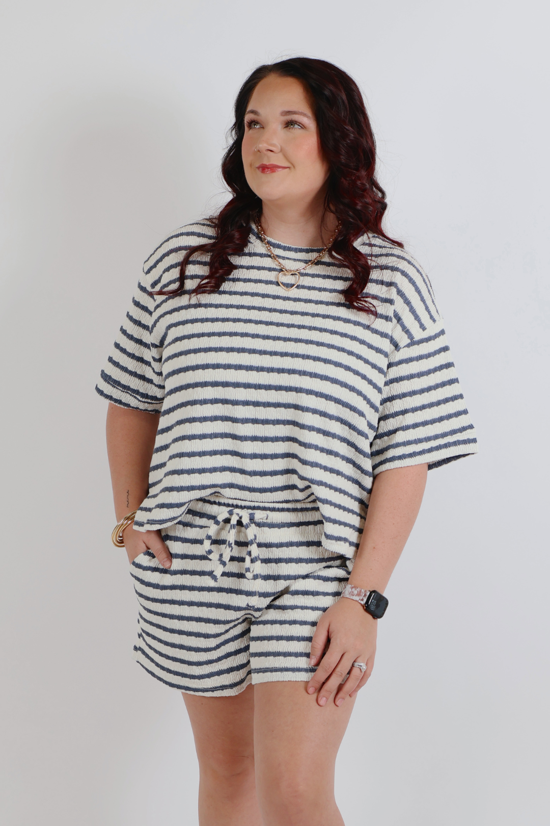 The Marlowe Stripe Lounge Tee & Shorts Set is the definition of effortless comfort with a polished, boutique feel. Designed in a soft striped knit, Marlowe features a relaxed short sleeve tee paired with easy pull-on shorts for an elevated take on everyday loungewear. The loose, drapey fit makes this set comfortable enough for home while still cute enough for errands or casual outings.