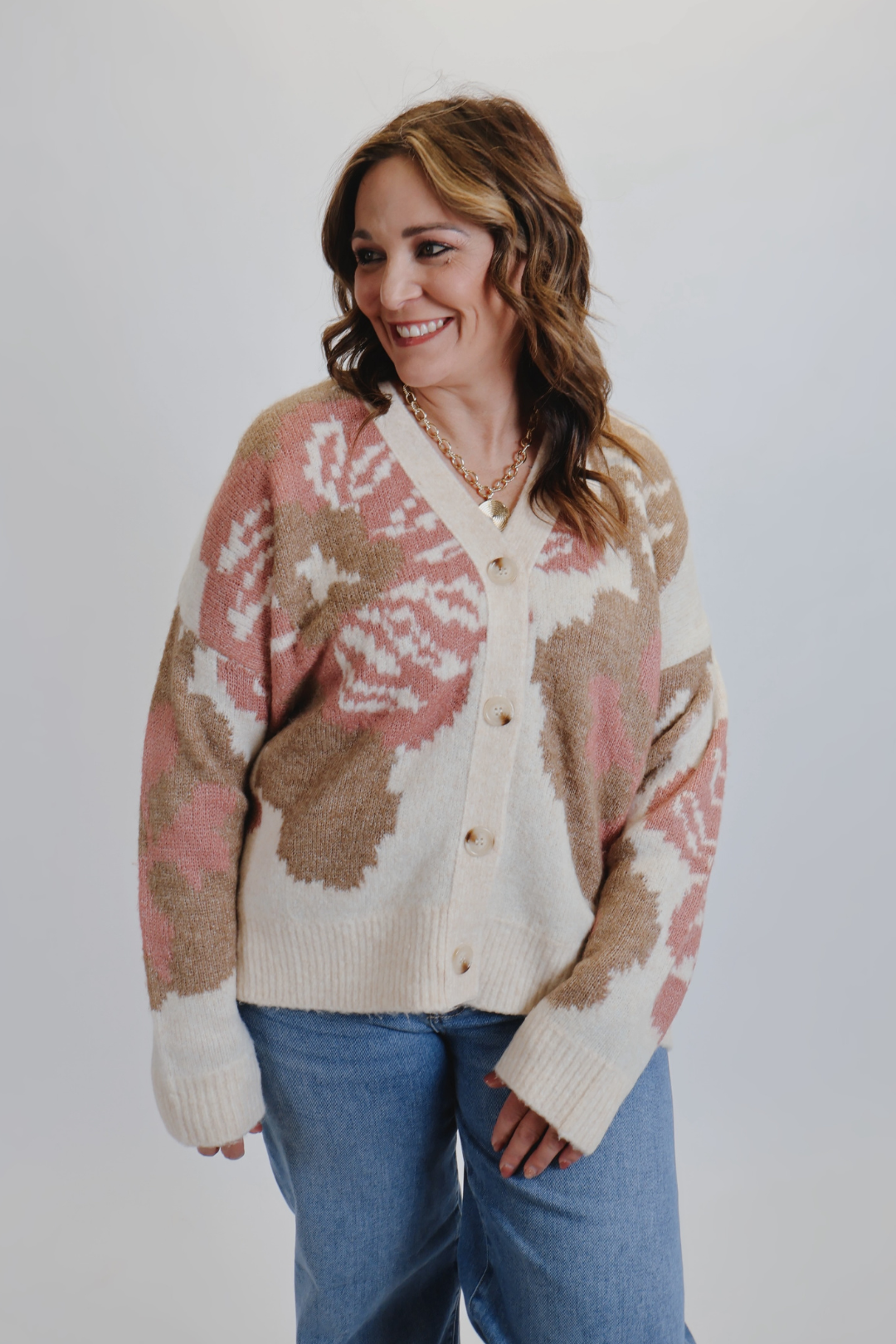 Wrap yourself in cozy charm with the Meadow Bloom Button Cardigan — a soft, vintage-inspired knit that feels as sweet as it looks. Designed with a delicate flower print in warm, earthy tones, this button-front cardigan brings a touch of femininity to any outfit. The deep V-neckline and ribbed cuffs and hem add classic structure, while the relaxed fit makes it perfect for layering over tanks, tees, or dresses.