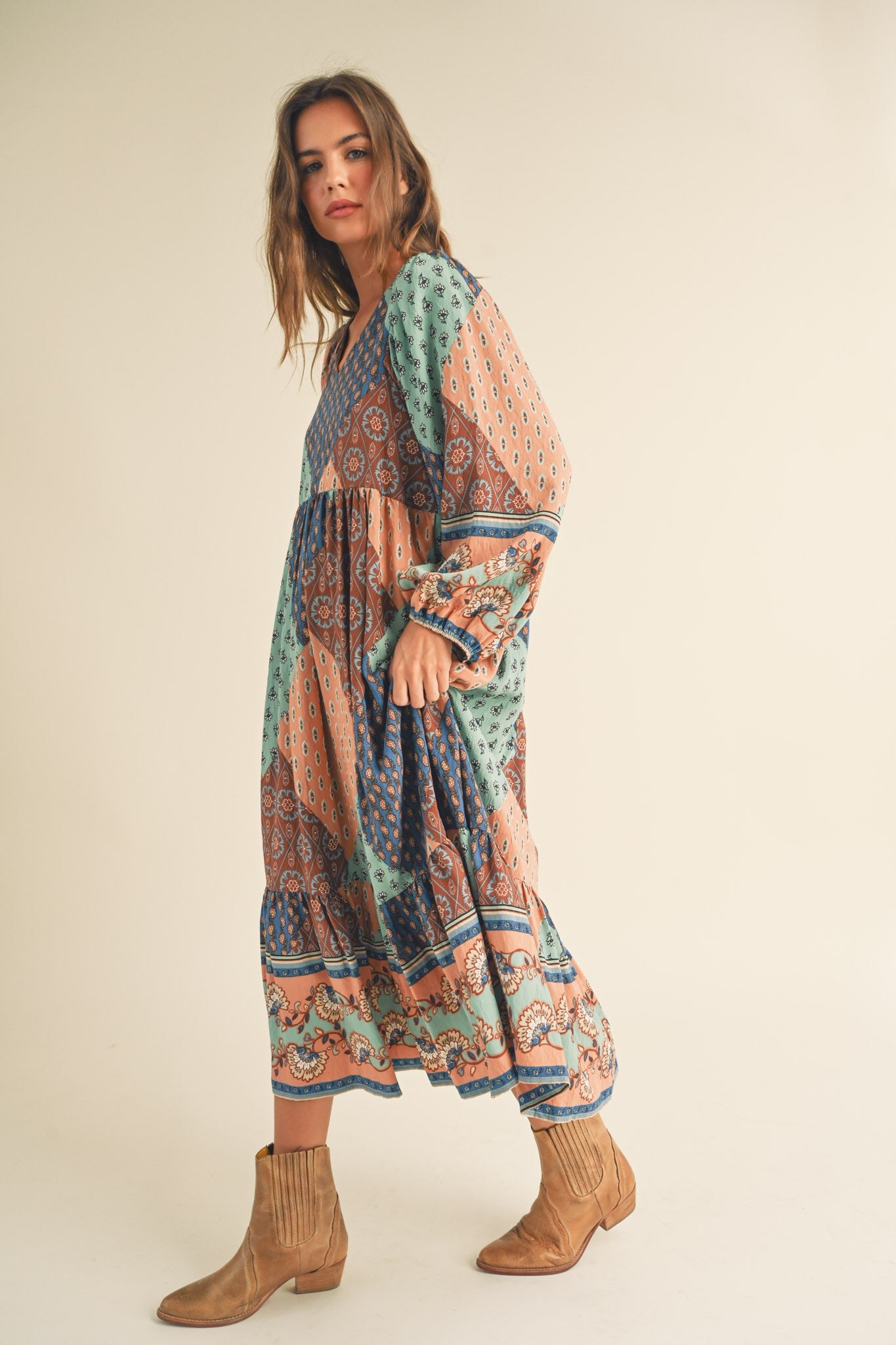 Step into effortless boho beauty with The Sage Meadow Patchwork Midi Dress. Designed in a &merci exclusive print, this dress blends earthy tones of sage, clay, and indigo in a vintage-inspired patchwork motif that feels both timeless and unique. The soft woven fabric drapes beautifully over a relaxed bodice with a flattering high waist seam, while the V-neckline adds a feminine touch. Long balloon sleeves with elastic cuffs give it a breezy, romantic vibe, and the flowy tiered midi skirt finishes with a ruffled hem for graceful movement. Thoughtful side pockets add everyday ease—perfect for both casual days and fall gatherings alike.