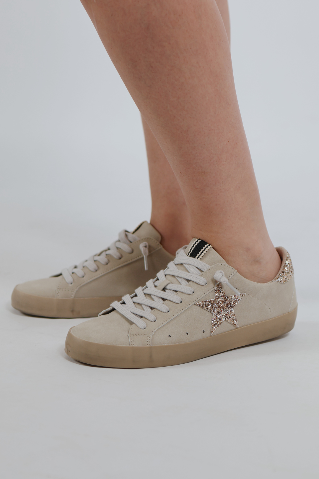 Desert tones, elevated. The Paula in Sand Suede offers a soft, earthy twist to our iconic star sneaker. With its faux suede upper and tonal glitter accents, it brings quiet texture and subtle shine to your every move. Perfect for casual days or dressed-down nights, this neutral works with everything.
