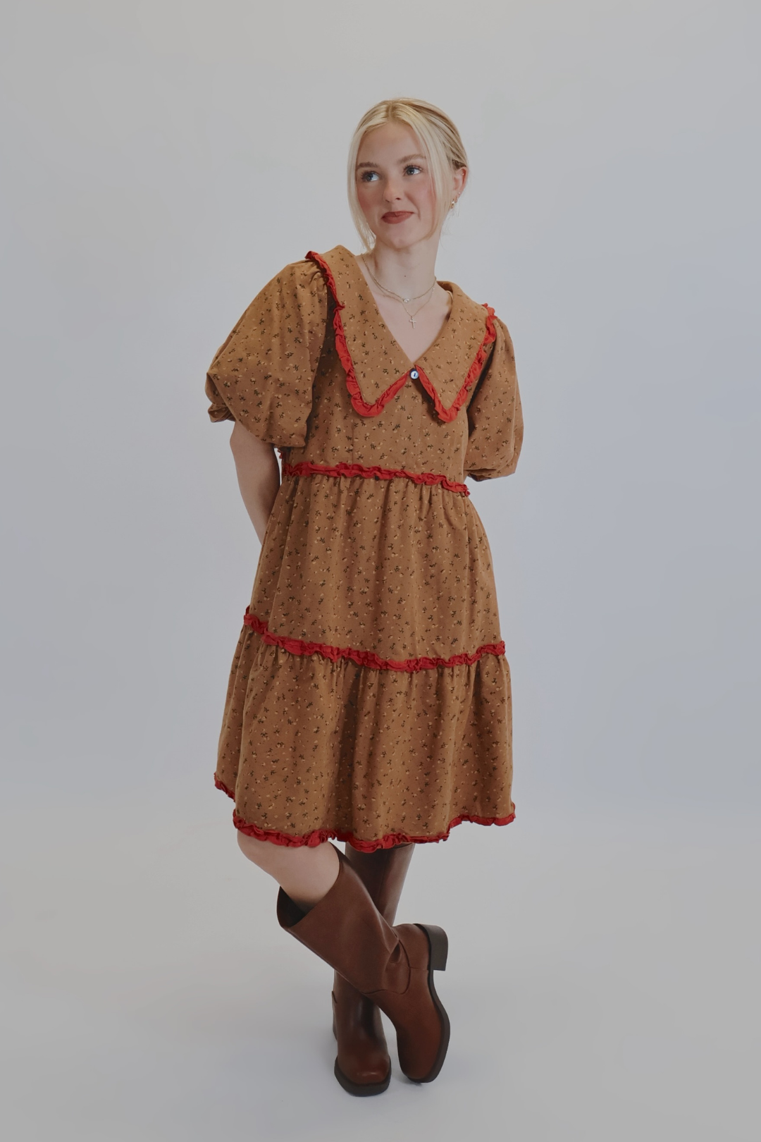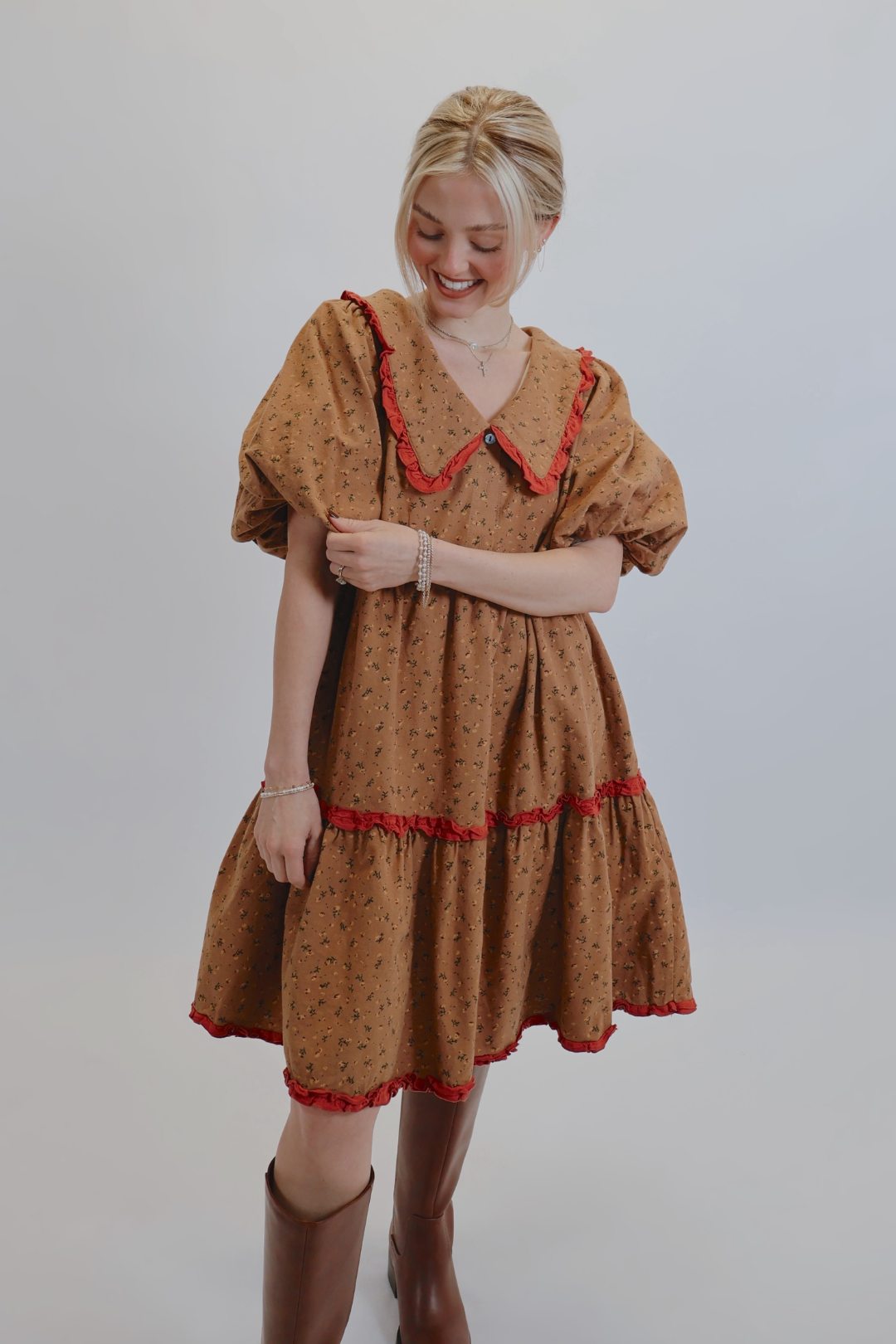 Capture that sweet country charm with our Prairie Petal Cotton Mini Dress! Crafted from soft, mineral-washed cotton, this darling dress features a dainty floral print and flirty ruffle trim in a bold contrast hue. The oversized Peter Pan collar adds a nostalgic touch, while the tiered A-line silhouette and puff sleeves keep it effortlessly feminine and flattering. Finished with a button-front closure for a vintage-inspired twist, this easygoing piece pairs perfectly with your favorite cowgirl boots or casual flats.