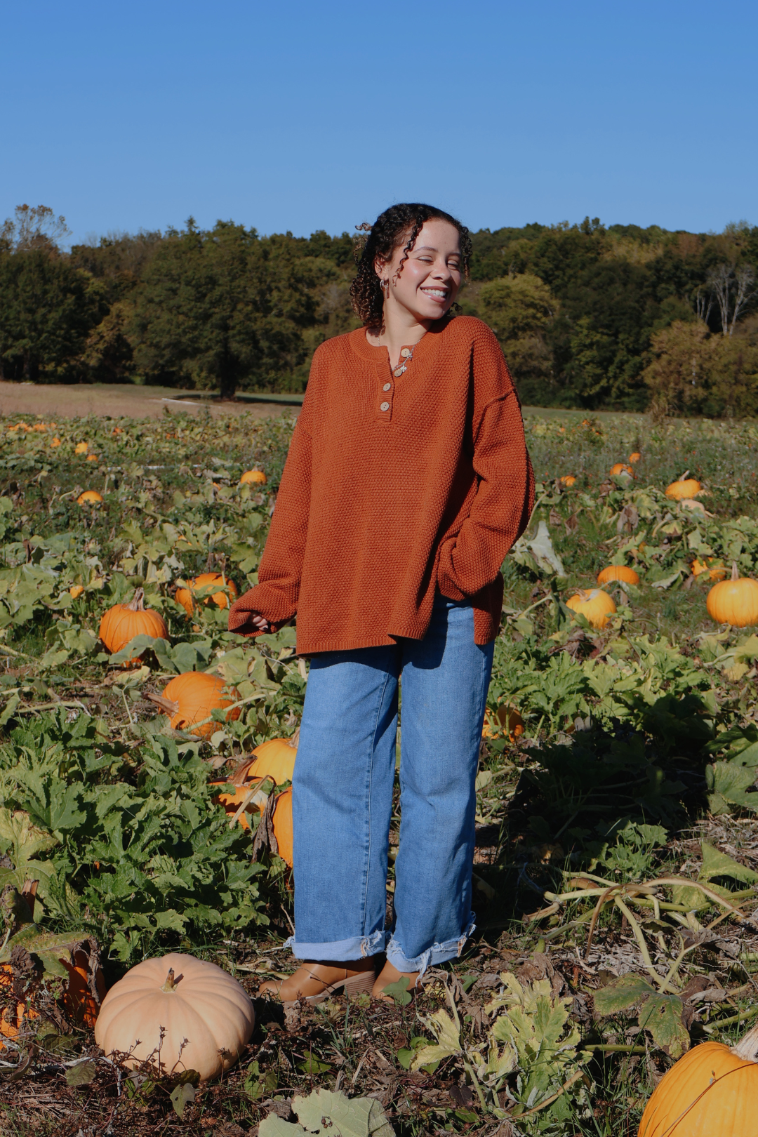 Cozy meets chic in our Rustic Charm Henley Knit Sweater, the perfect blend of comfort and effortless style. Featuring a classic henley-style pullover with a notched neckline and button details, this sweater is designed with a textured knit finish that adds depth to your look. The slight high-low hem with side slits makes it easy to wear tucked in or loose for a relaxed vibe.