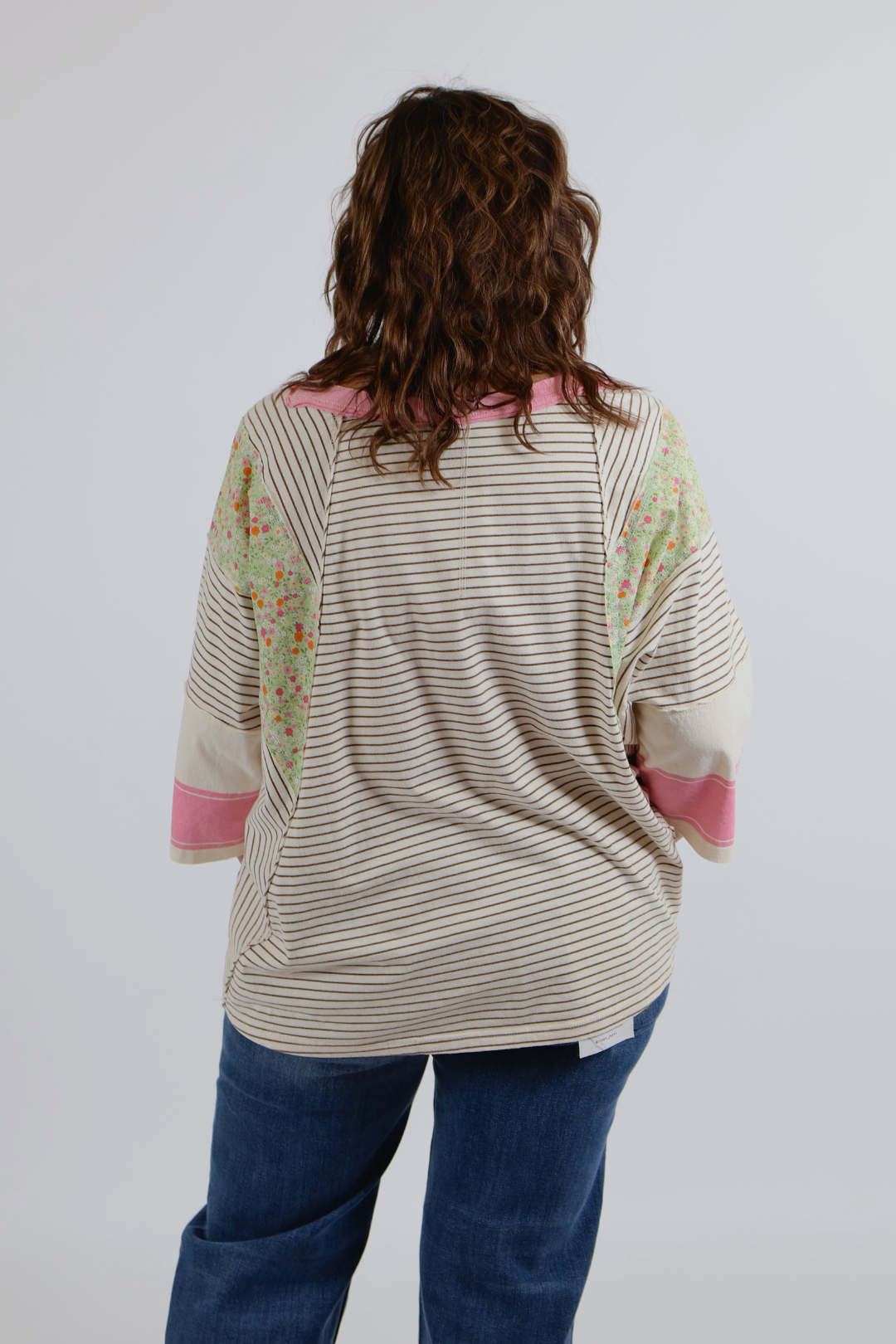The Sadie Patchwork Stripe Top is the perfect mix of casual comfort and playful detail. Designed in a soft washed knit, this relaxed oversized silhouette features classic horizontal stripes paired with floral print panels for that effortless boutique vibe. The dropped shoulders and 3/4 sleeves keep it easy and laid-back, while the colorblocked cuffs and contrast neckline add just the right pop of personality. It’s the kind of top that feels comfy like your favorite tee but looks completely styled.