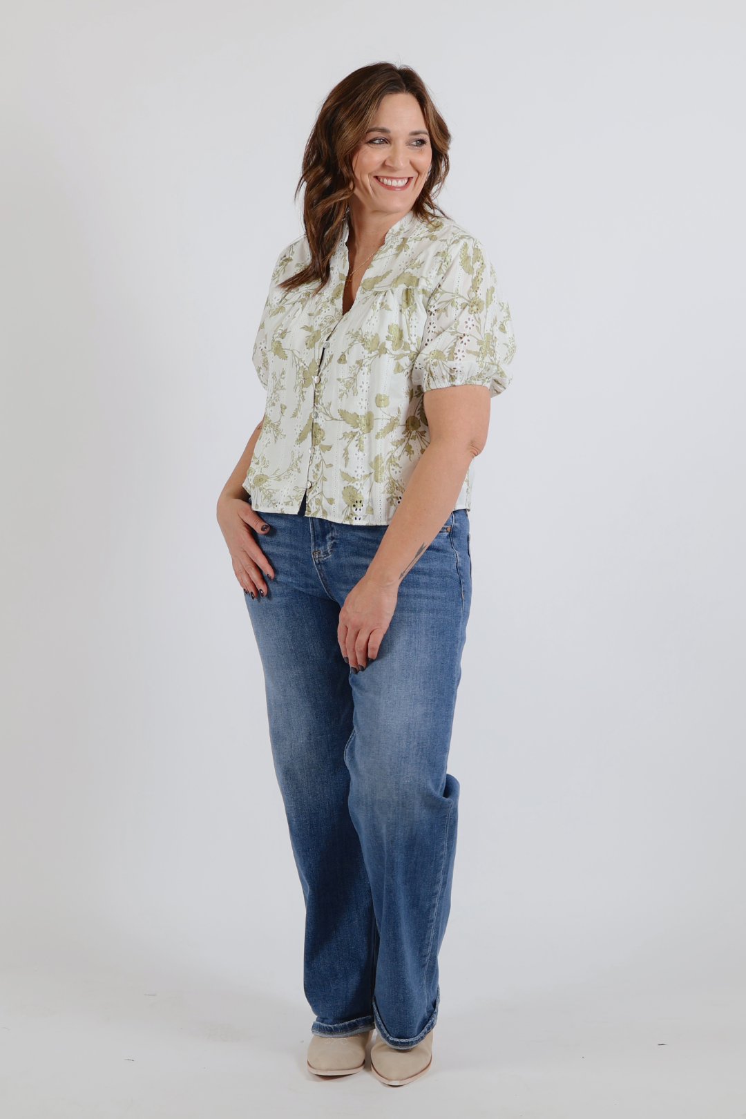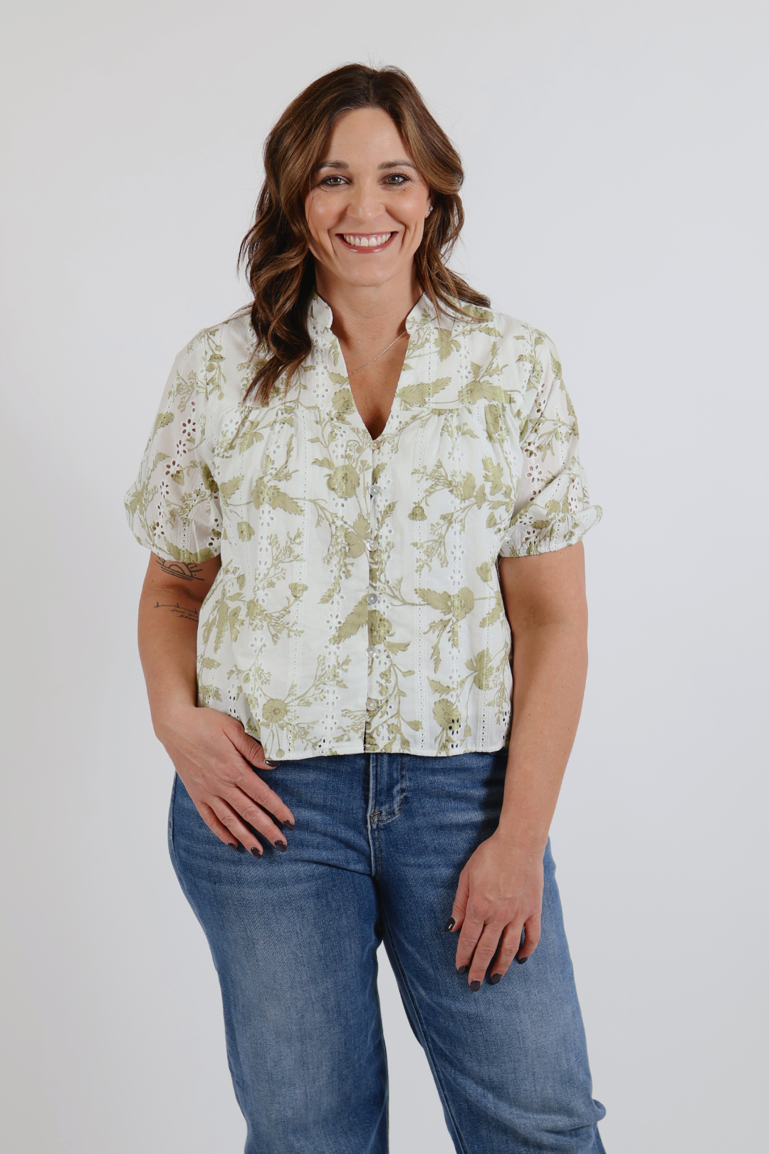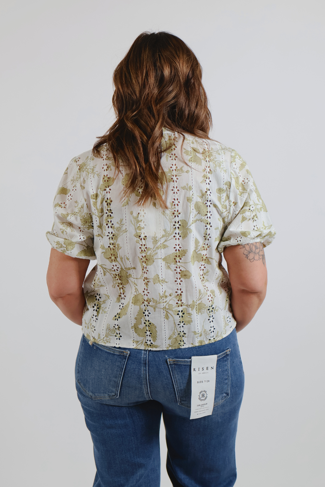 Soft, feminine, and effortlessly pretty, the Willow Bloom Eyelet Top is a timeless addition to your everyday wardrobe. Featuring a delicate floral print with eyelet detailing, this lightweight woven top is designed with puff sleeves, a flattering V-neck yoke, and a button-front closure for a polished finish. Elasticated cuffs add gentle volume to the sleeves, while the lined body offers comfortable coverage with a breezy, semi-sheer look. Perfect for pairing with denim or skirts, this top brings easy charm to any outfit.
