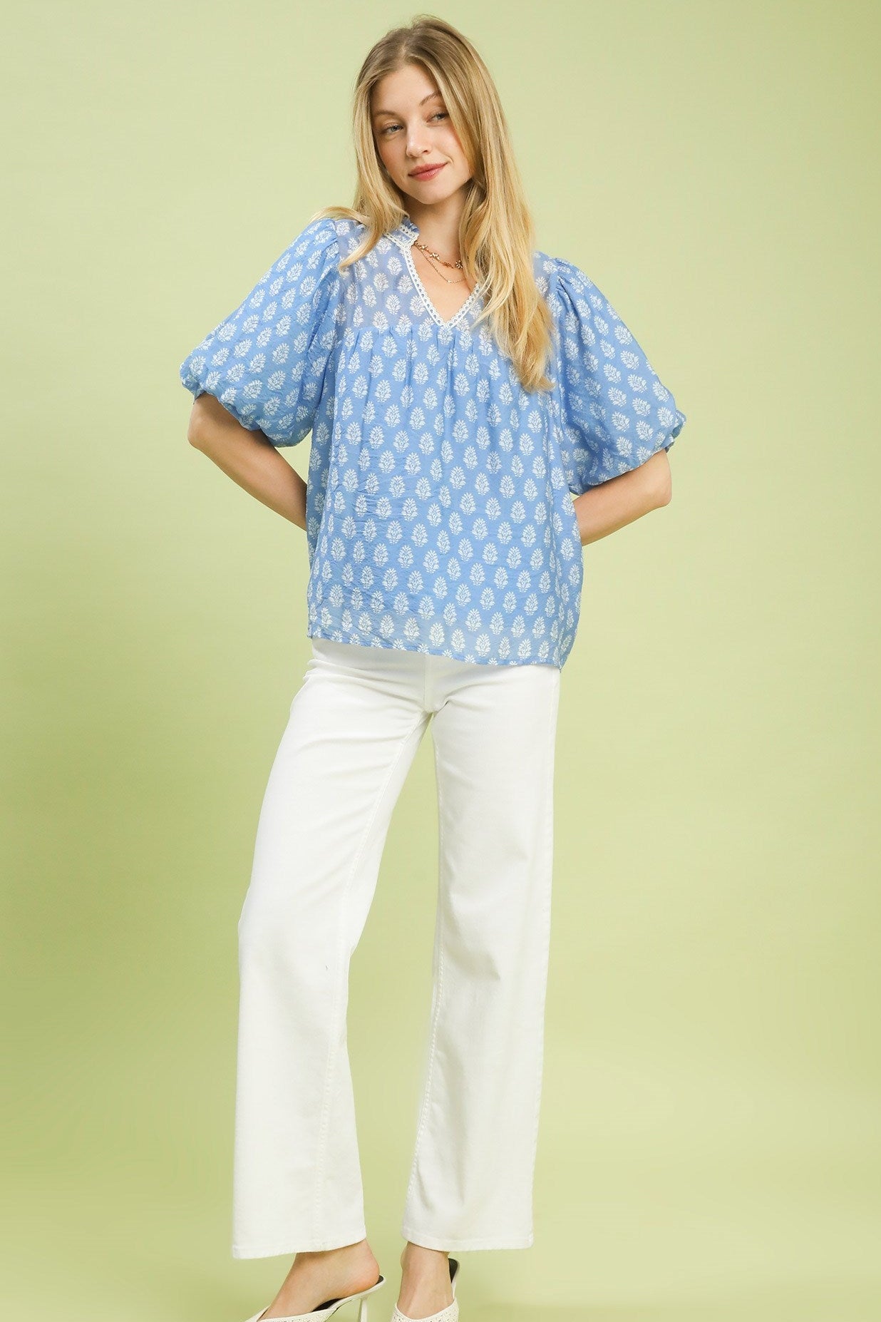A soft and feminine blouse designed to elevate your everyday wardrobe, the Soft Meadow Printed Top features a two-tone abstract print with a flattering V-neckline accented by delicate scalloped lace trim for a romantic touch. Puff short sleeves with elastic cuffs add gentle volume while keeping the fit comfortable and effortless.