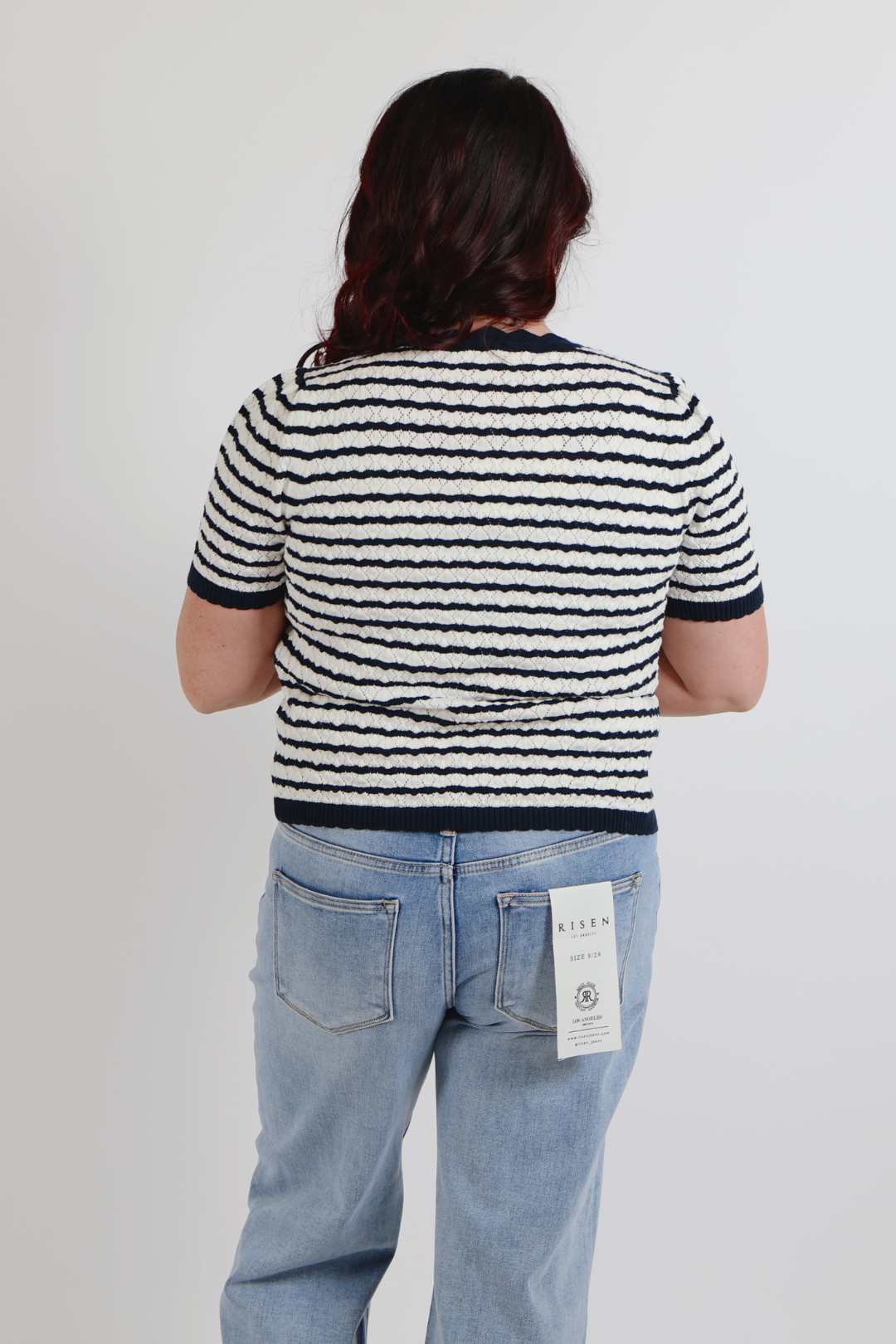 Chic with a soft feminine finish, the Coastal Poise Stripe Pointelle Top is a beautiful blend of classic and delicate detail. Designed with a timeless stripe pattern, this lightweight sweater knit features a subtle pointelle texture, scalloped edge trim, and a polished button-front closure. The short sleeves and breathable cotton blend make it perfect for warm-weather styling, while the semi-sheer knit adds an elevated, boutique-worthy touch. Easy to dress up or down, this top pairs effortlessly with denim, trousers, or skirts.