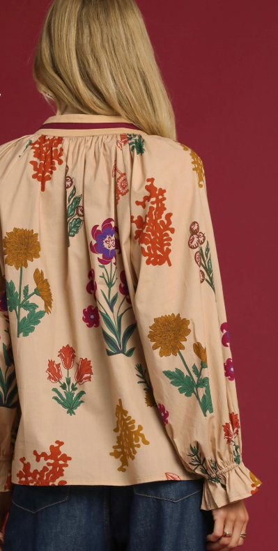 Elevate your everyday style with the Wild Bloom Contrast Trim Top. Crafted from 100% breathable cotton, this beauty features a vibrant floral print that instantly brightens your look. The contrast binding along the V-neckline adds a touch of chic detail, while the relaxed fit and billowy sleeves bring effortless charm. Perfect for layering or wearing on its own, this lightweight, unlined top is as versatile as it is stylish.