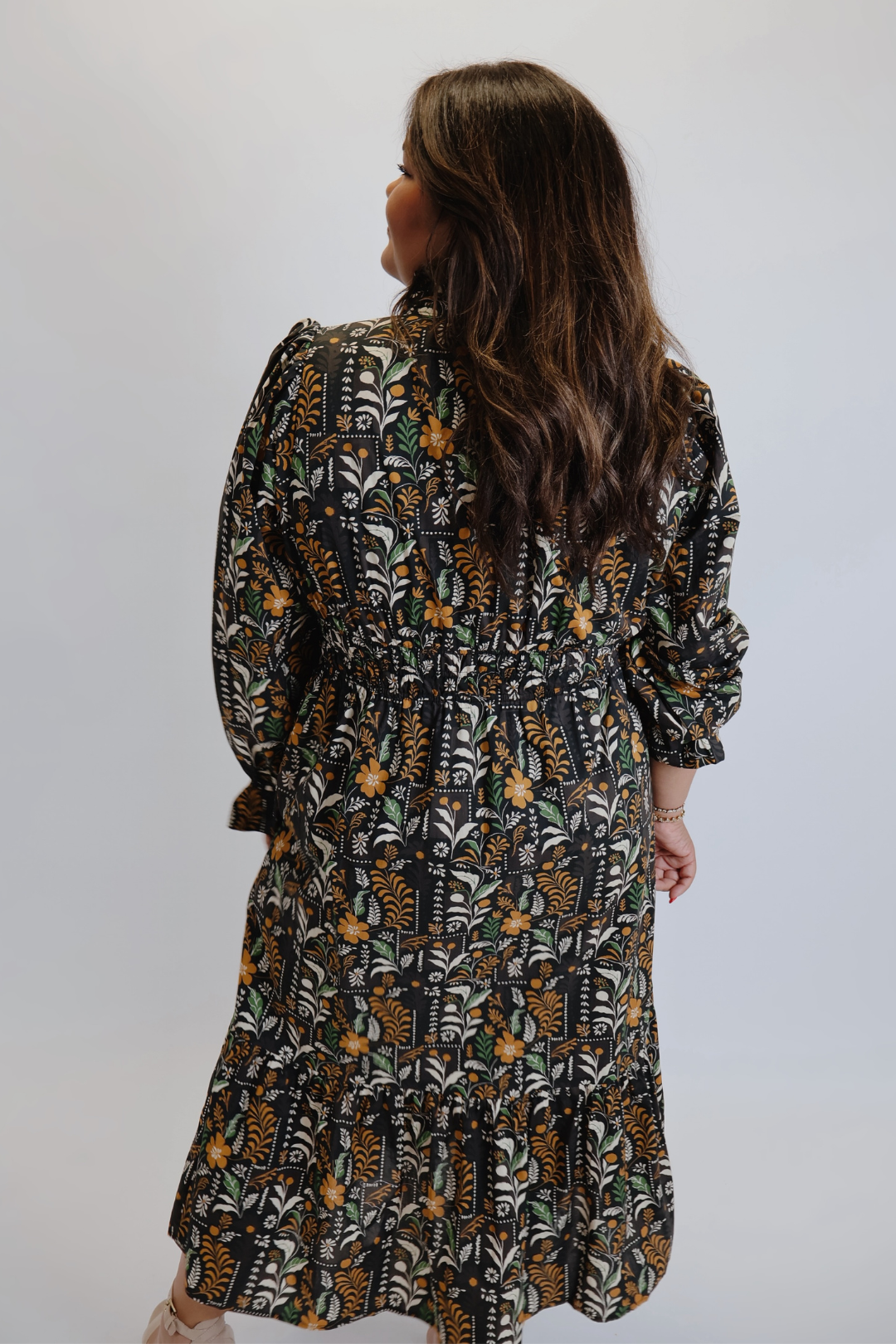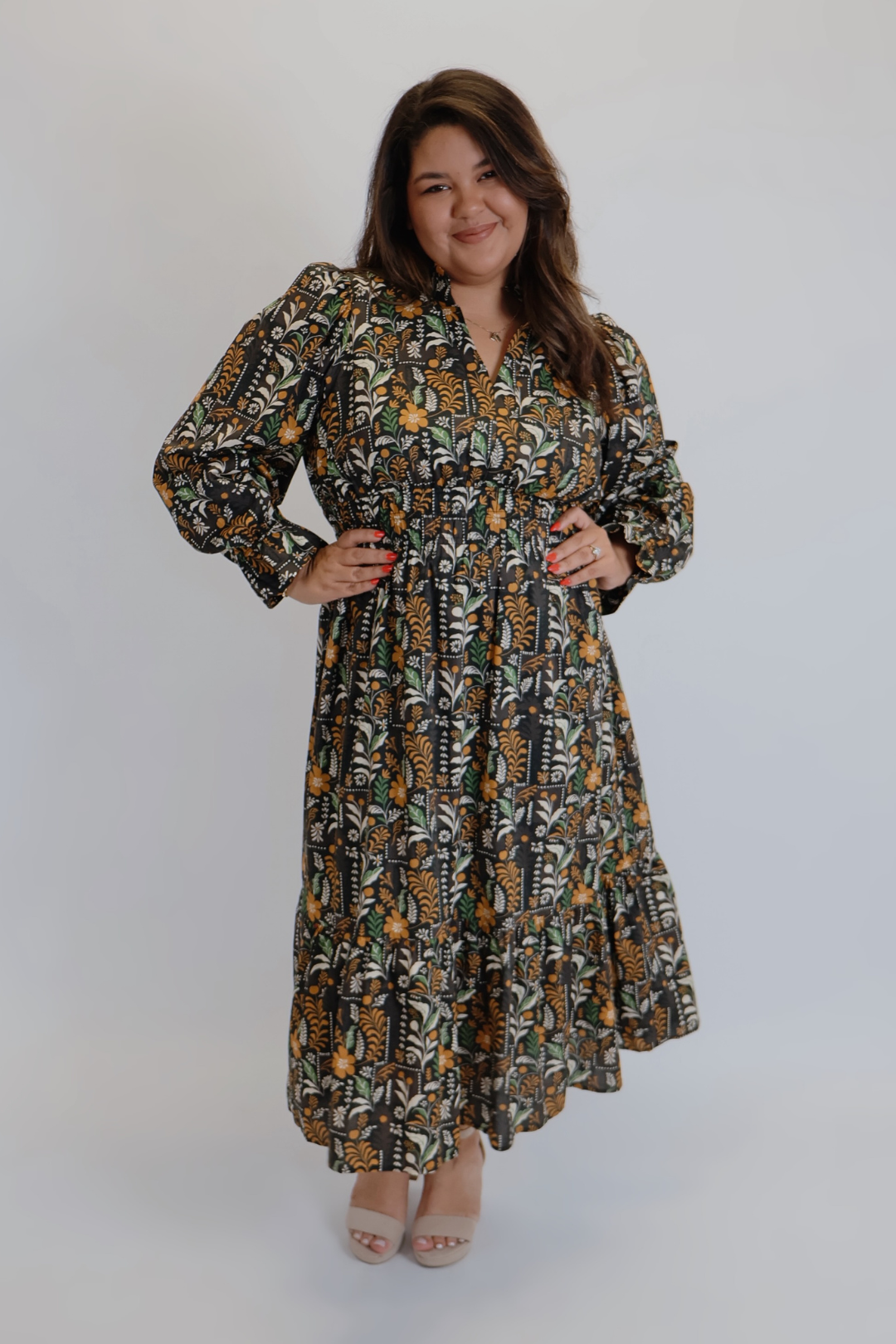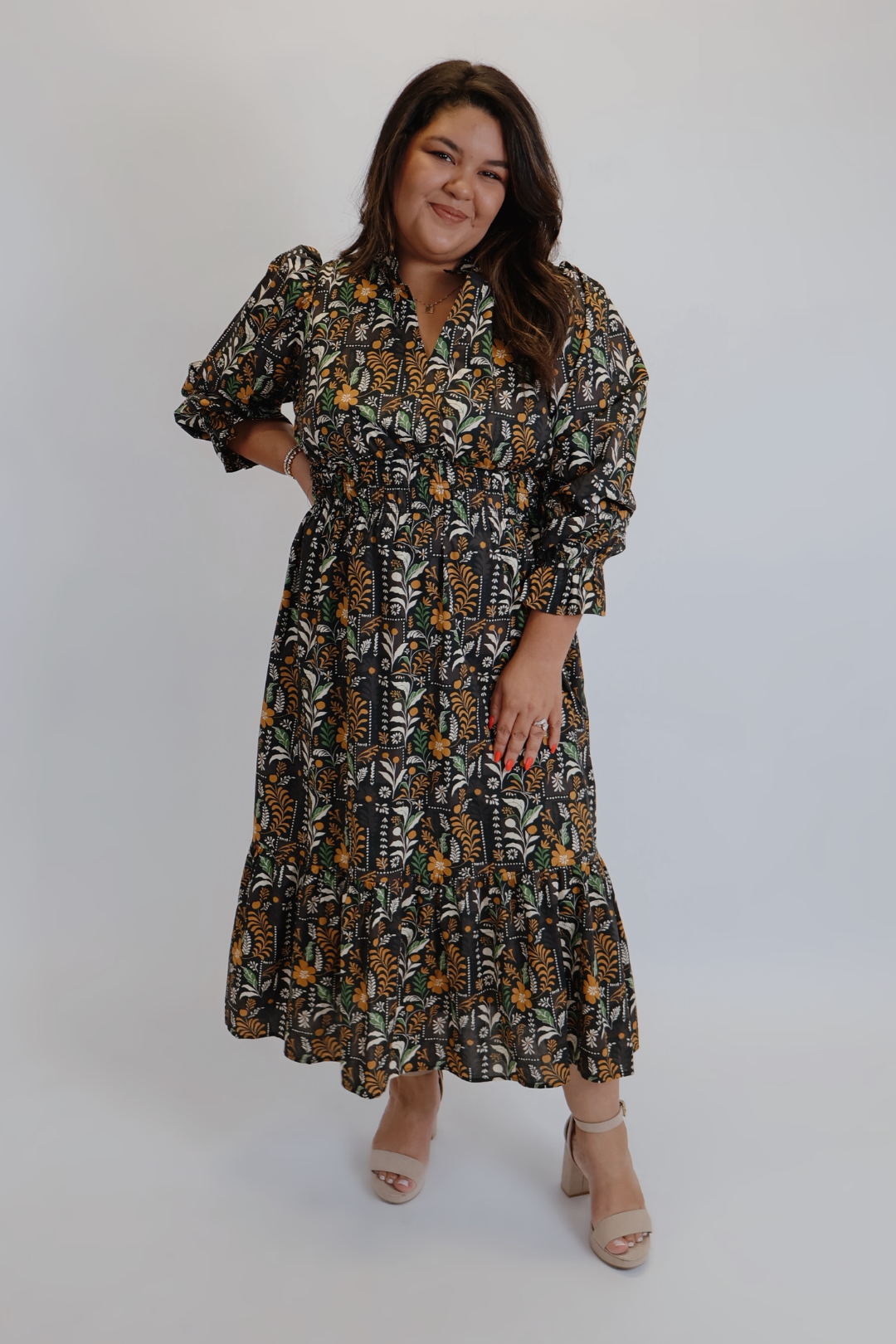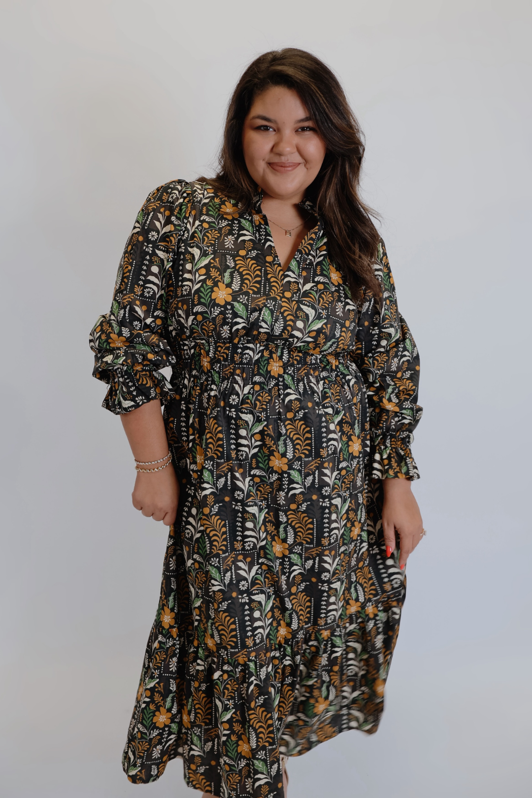 Embrace your wild side with the Wildflower Embrace Midi Dress in Plus. Featuring a flattering smocked waist and a playful V-neckline, this dress is finished with charming ruffle details on the collar and elastic cuffs. Its long sleeves and soft lining make it perfect for twirling through any season with ease and style.