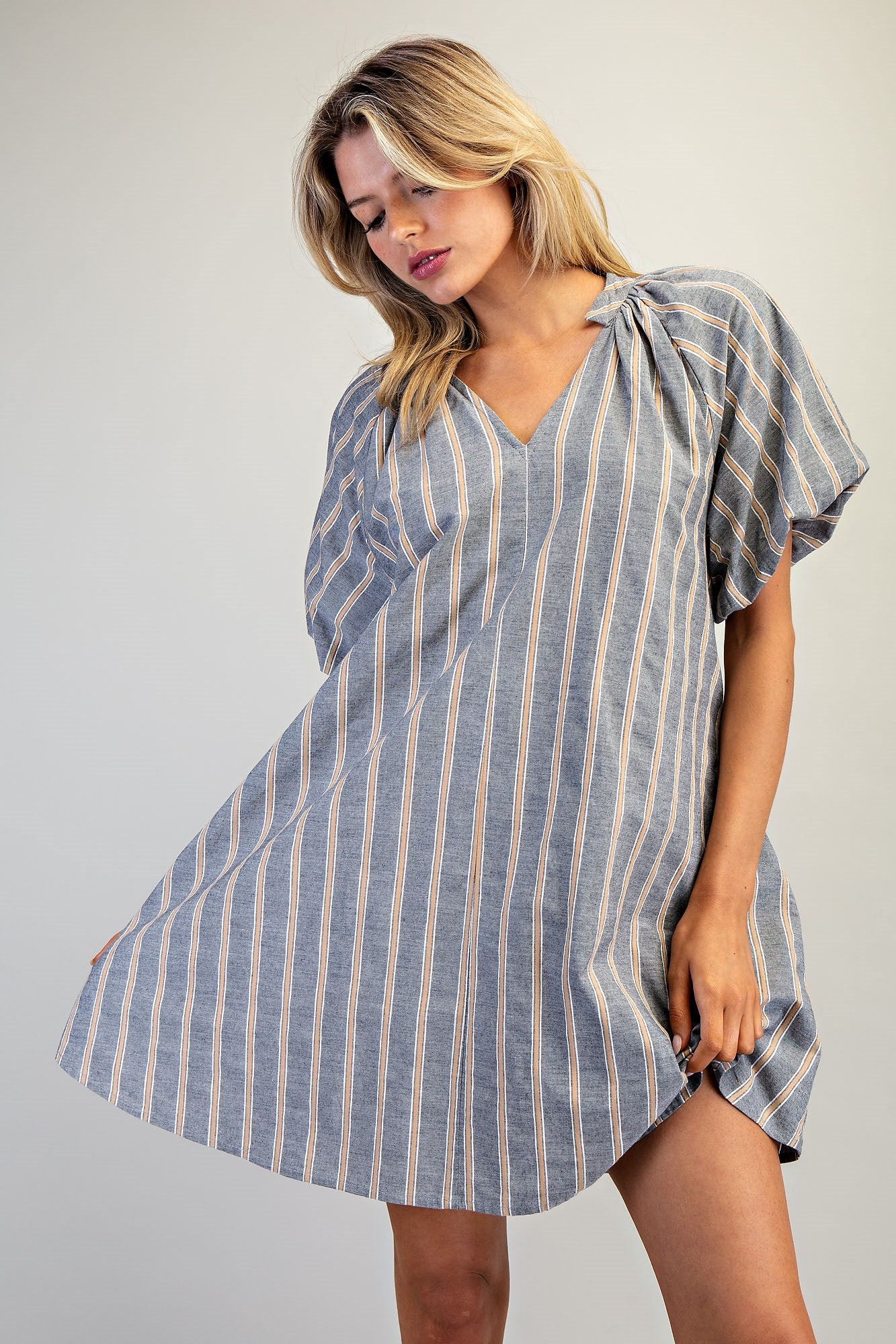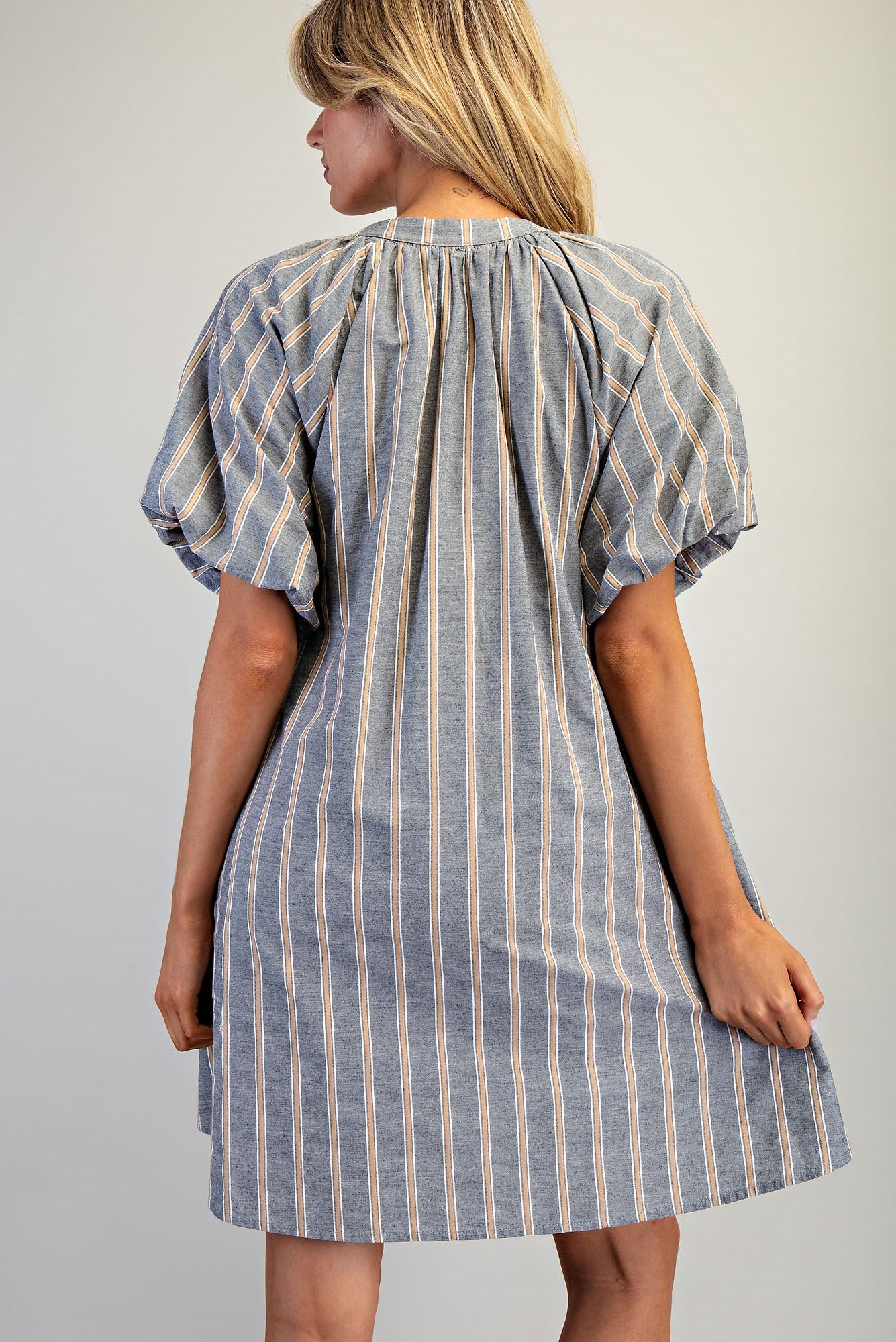 Easy, breezy, and effortlessly chic, the Willow Stripe Mini Dress is your go-to for warm days and casual outings. Designed with soft vertical stripes, this dress features a gathered V-neckline that adds subtle shape while keeping the look relaxed and flattering. Short puff sleeves bring a touch of feminine volume, and the airy A-line silhouette allows for comfortable movement. Finished with side pockets for everyday ease, this cotton mini is perfect for brunch dates, weekend errands, or laid-back summer evenings.