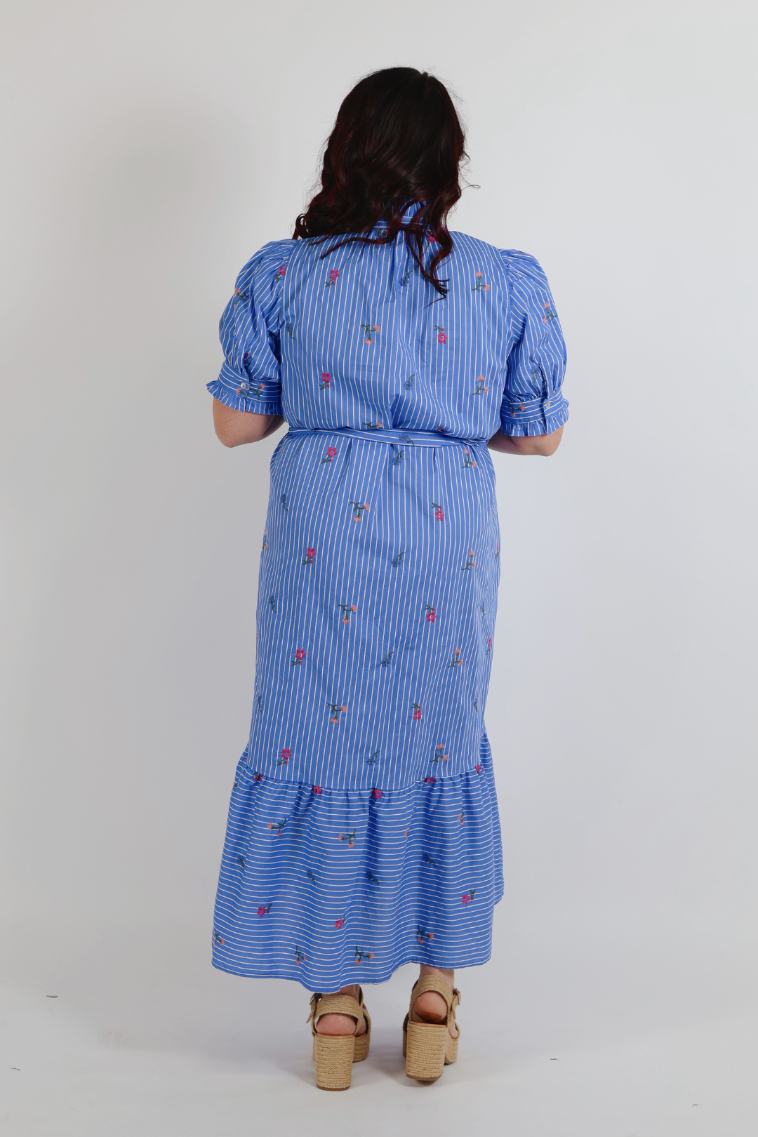 Soft, feminine, and effortlessly elegant, the Bluebell Grace Floral Midi Dress is a timeless piece made for everyday beauty. Featuring a delicate floral print on a soothing blue backdrop, this midi dress is designed with short puff sleeves, a flattering button-front bodice, and a self-tie waist that creates a beautifully defined silhouette. The gently flared skirt adds graceful movement, making it perfect for brunch, church, showers, or special daytime occasions.