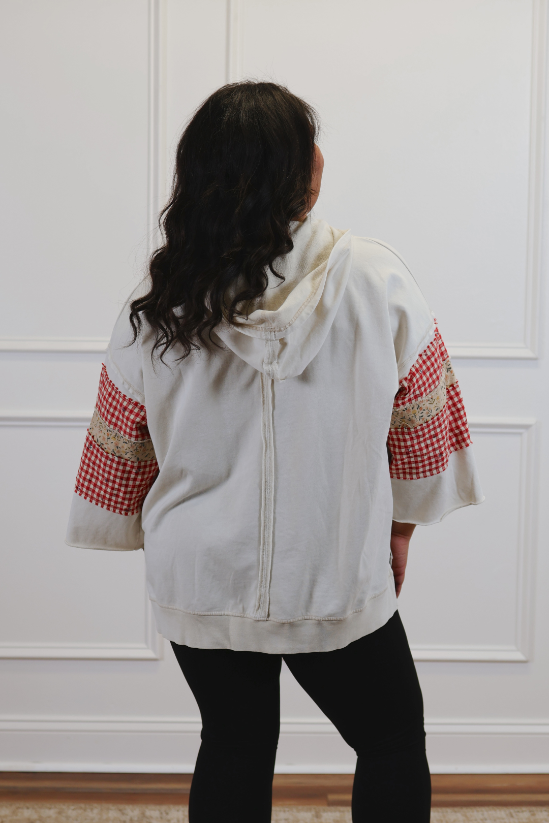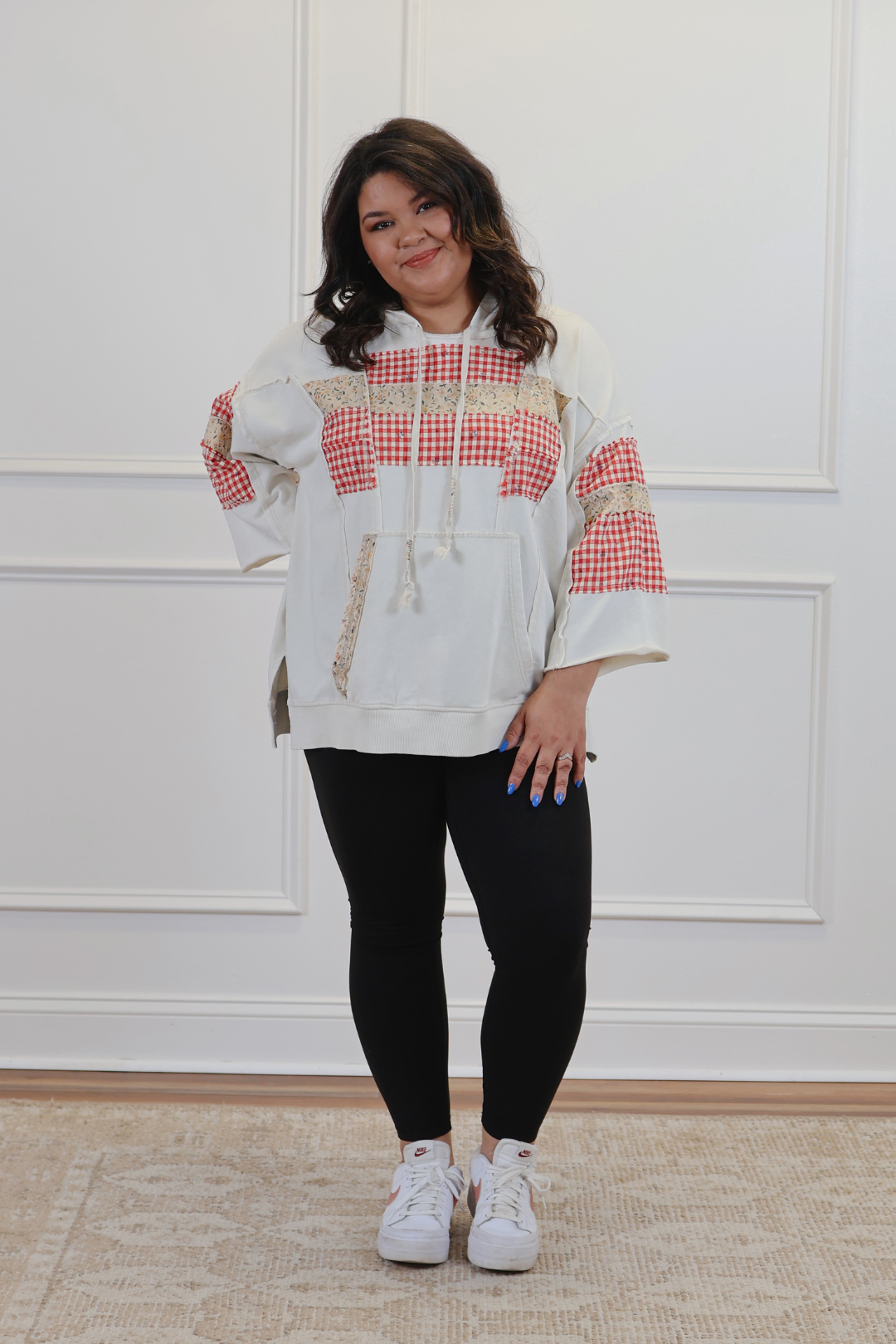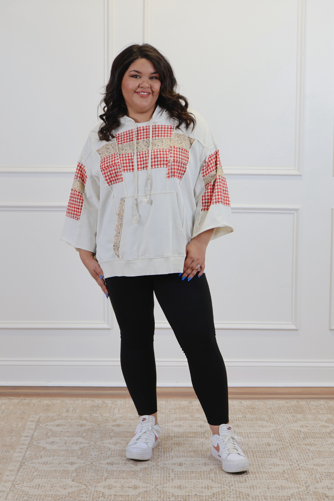 The Everly Patch Mix Pullover blends cozy comfort with playful, patchwork charm. Designed in a mineral-washed knit, this relaxed, oversized hoodie features wide 3/4 sleeves, a kangaroo front pocket, and a soft hood with tassel-tipped drawstrings. Mixed floral and gingham patches add a handcrafted, quilt-inspired touch that makes each piece feel unique. Perfect for laid-back days, weekend errands, or pairing with your favorite joggers or denim.