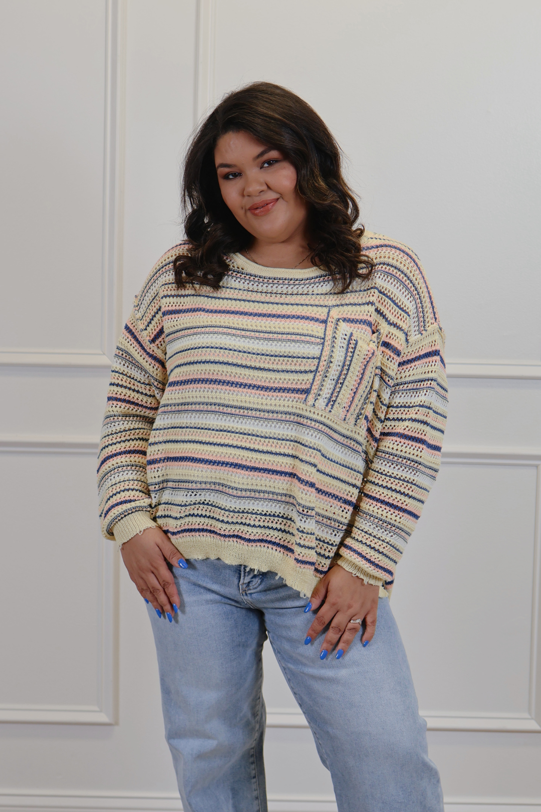The Harper Hills Crochet Sweater is your new go-to layering piece with effortless boho charm. Designed with a relaxed, oversized fit and a lightweight open-crochet knit, this sweater is perfect for year-round styling. The multi-color striped pattern adds the perfect pop of color, while the dropped shoulders and classic crew neckline create that laid-back, lived-in feel we love.