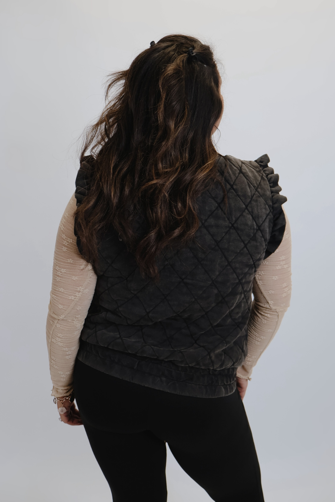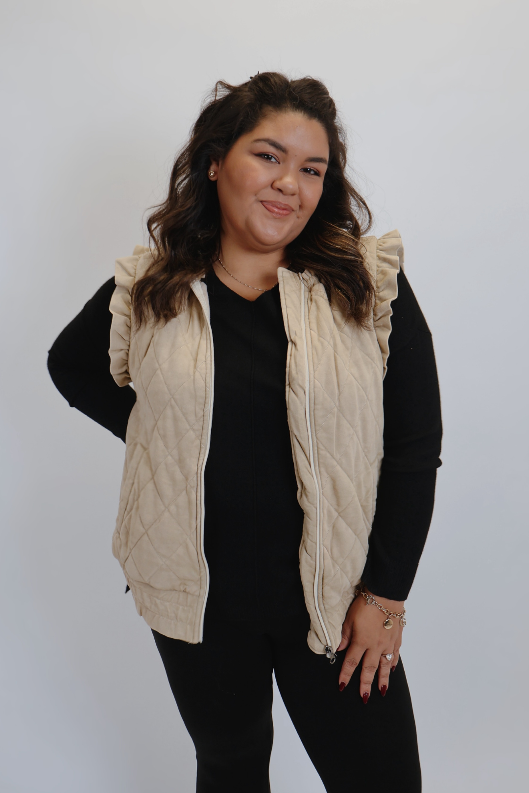 A timeless fall layer with a feminine twist. The Willow Ruffle Quilted Vest is crafted from 100% cotton and features soft quilted texture with charming ruffle-edged shoulders for just the right touch of detail. The cinched waist creates a flattering silhouette while side pockets and a front zipper closure keep it practical for everyday wear.