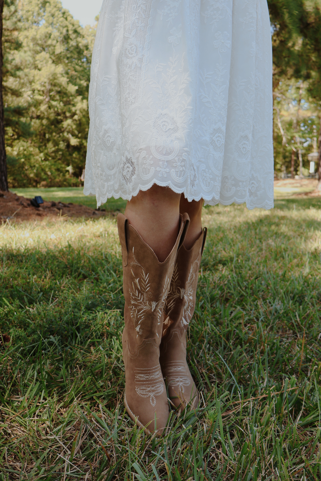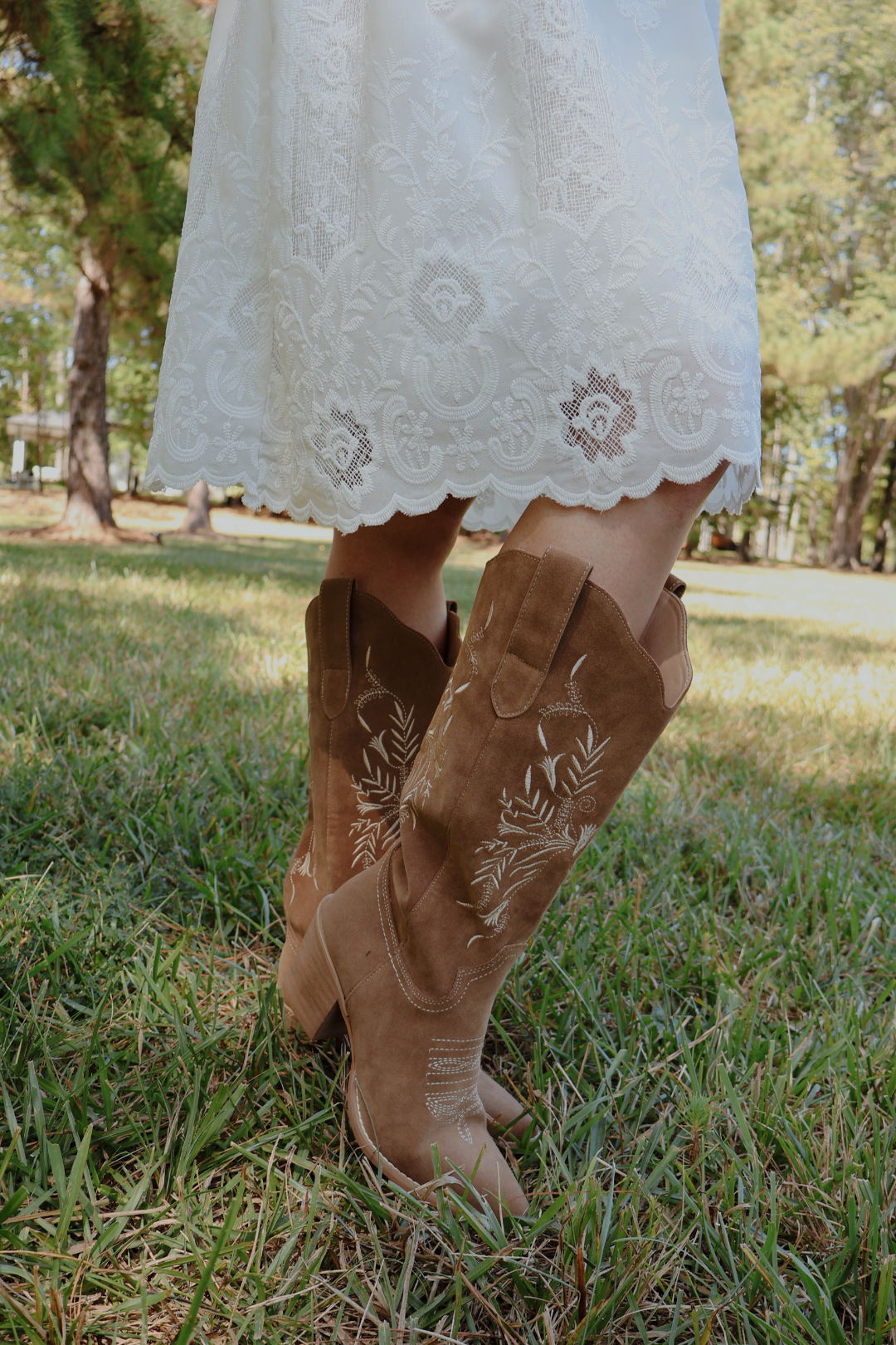 Step into timeless Western charm with the Flora Boot in Taupe. Crafted from soft suede with delicate embroidered detailing, this mid-calf cowboy boot combines rustic roots with modern sophistication. The curved shaft, pointed toe, and stacked wooden heel create a flattering silhouette that pairs effortlessly with dresses, denim, or your favorite flowy layers.