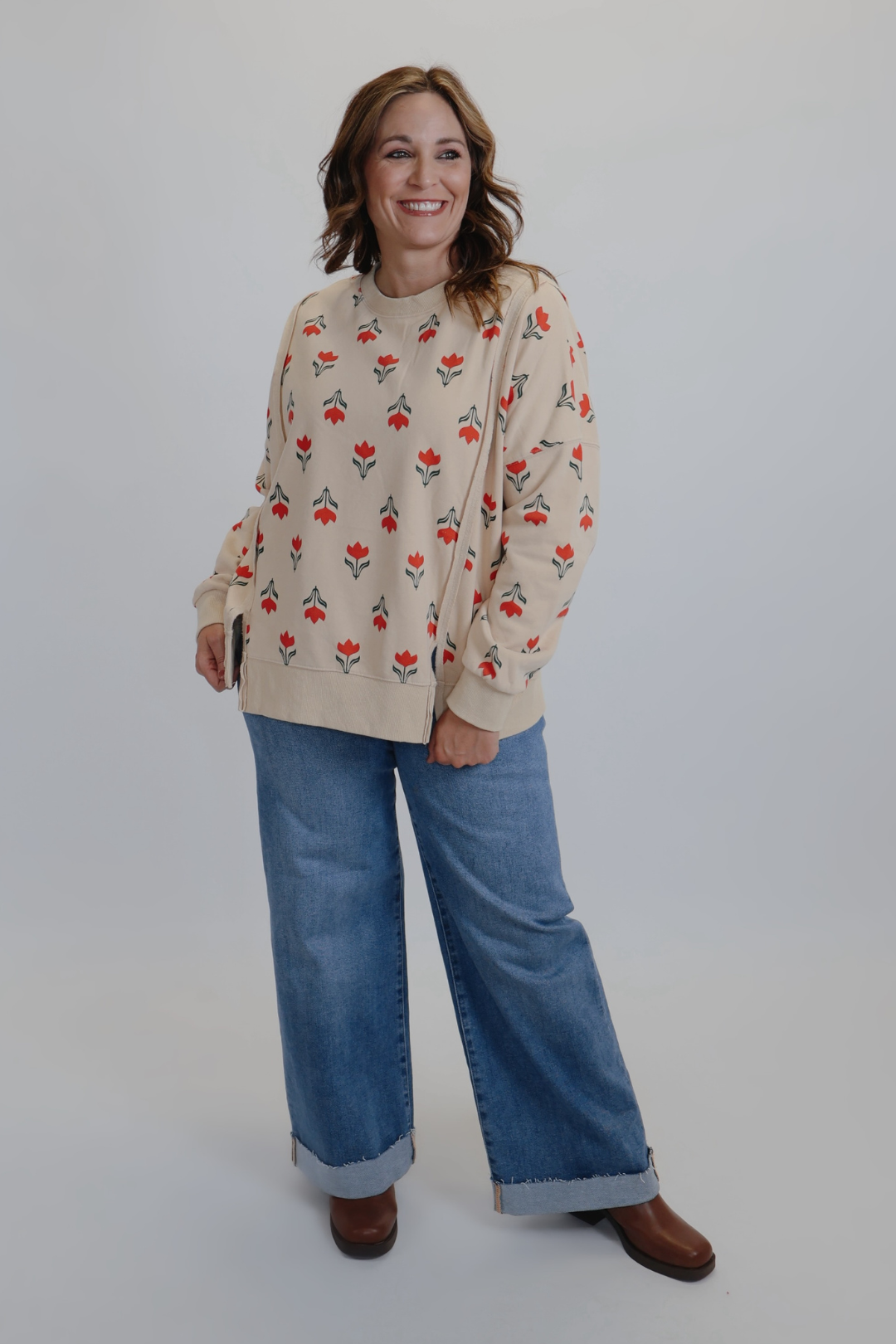 Embrace cozy vibes with the Washed in Bloom Pullover, featuring a soft mineral wash and an oversized fit for ultimate comfort. This playful sweatshirt showcases a charming all-over tulip print, ribbed crew neckline, and dropped shoulders for a relaxed look. Side hem slits add a touch of flair, making it perfect for layering or lounging in style.