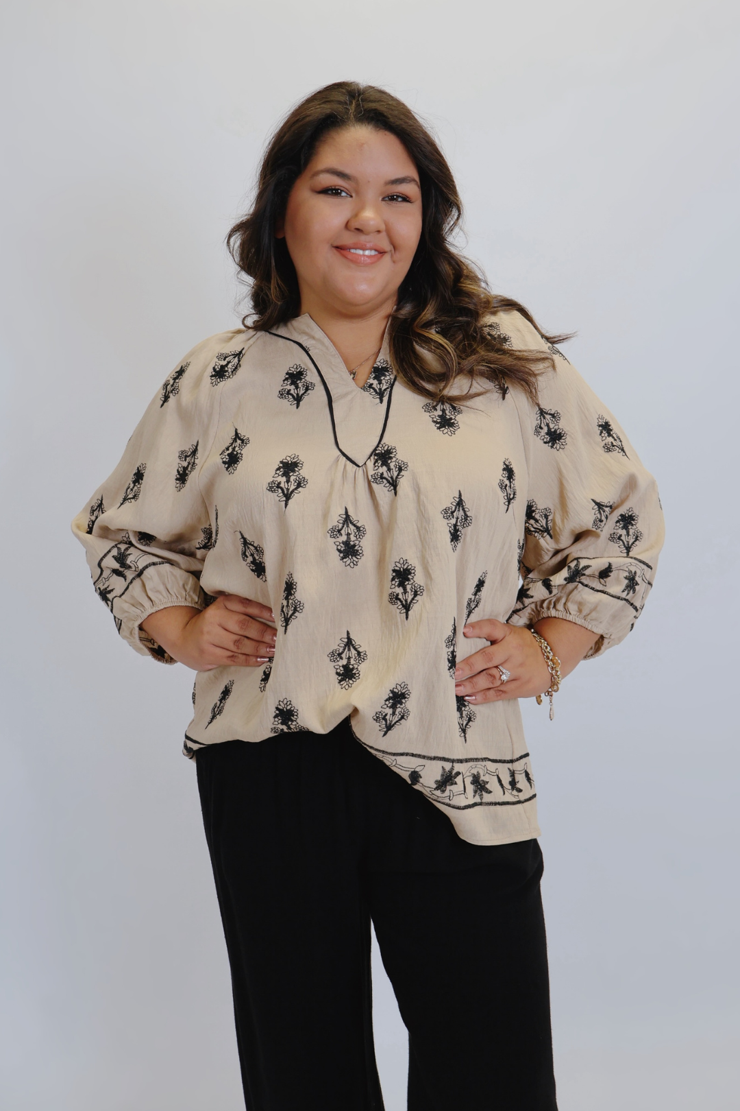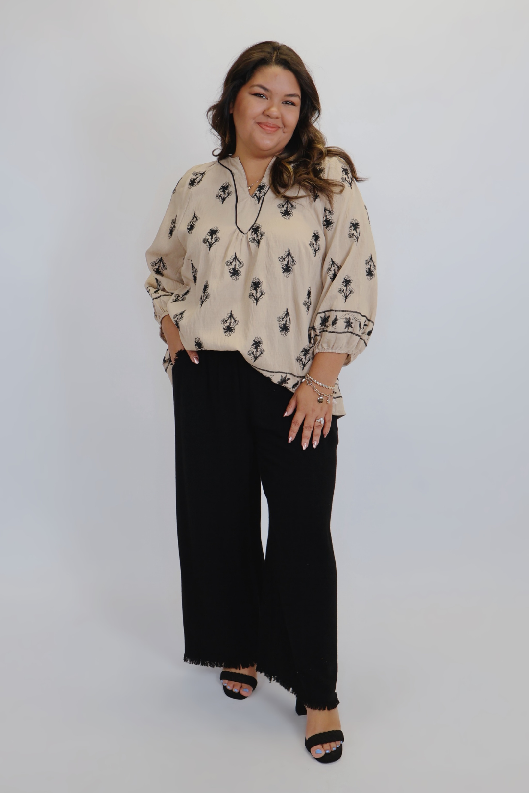 Effortlessly elegant with a touch of bohemian charm, the Boho Bloom Embroidered Peasant Top is your new go-to for elevated everyday style. This relaxed-fit blouse features intricate black floral embroidery throughout, gathered balloon sleeves, and a flattering split neckline with contrast piping. Pair it with trousers for a chic daytime look or dress it down with denim for weekend vibes.