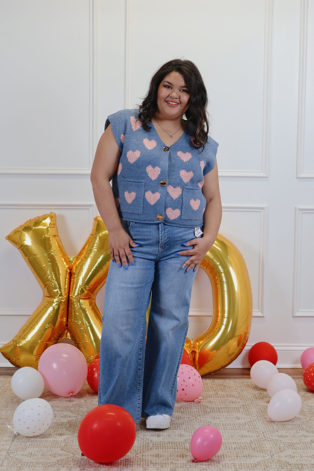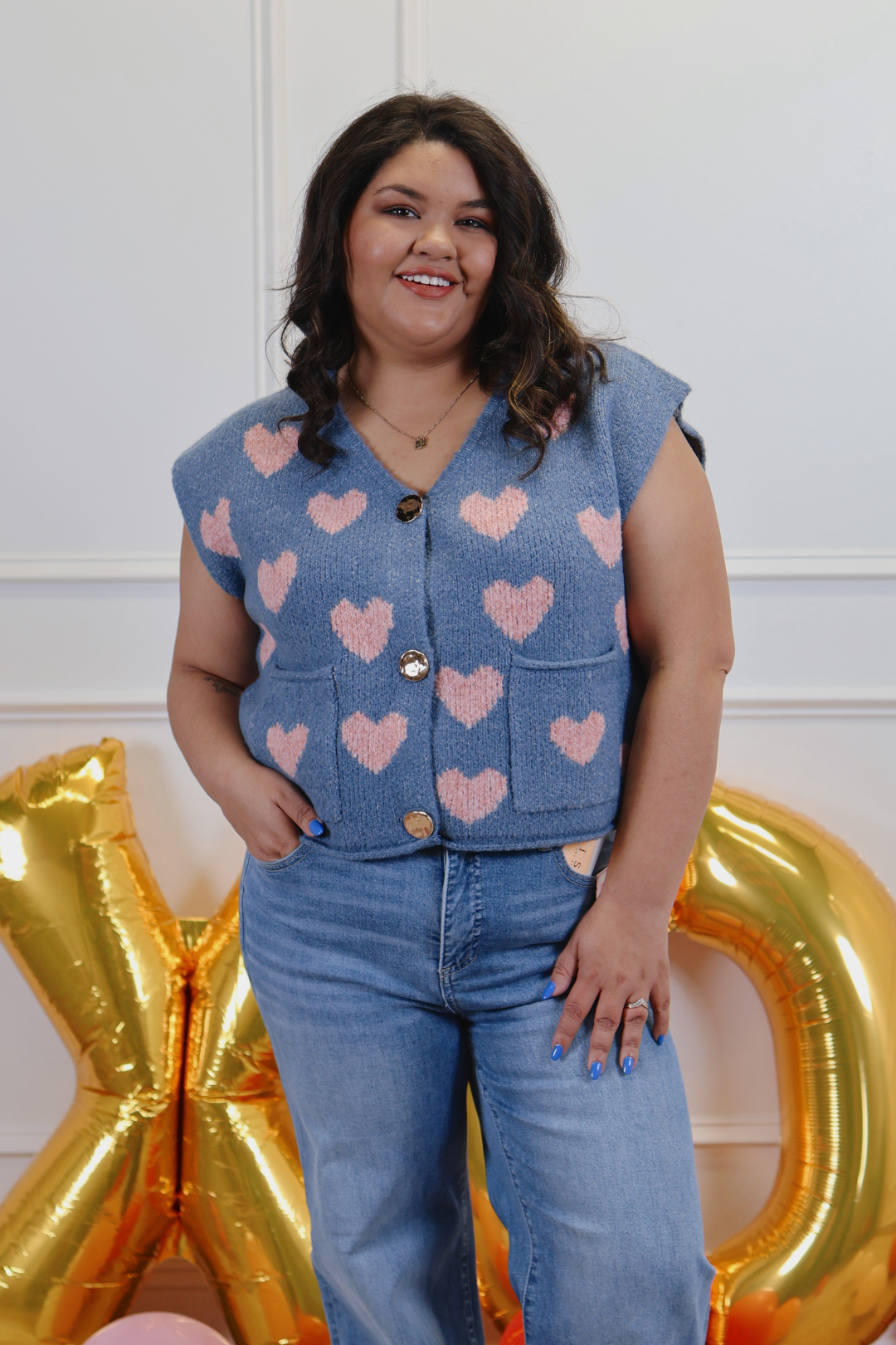 Fall head over heels for this cozy-cute statement piece. The Heartstrings Button-Front Sweater Vest features an all-over heart pattern that adds a playful pop of charm, while the soft knit fabric keeps things comfy and wearable. Finished with gold metal buttons and a relaxed, easy fit, this vest is perfect for layering over long sleeves or styling solo as a top.